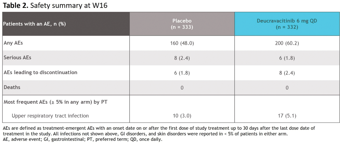 Results: Among 670 randomized patients, 336 received deucravacitinib 6 mg QD, and 334 received placebo. Demographics and baseline disease characteristics were generally balanced between groups. ACR 20 was achieved in significantly more patients treated with deucravacitinib vs placebo at W16 (54.2% vs 34.1%; P < 0.0001), with similar results for ACR 50 and ACR 70 (Table 1). ACR 20 responses were consistent, regardless of concomitant use of conventional synthetic DMARDs or hsCRP level at baseline. Statistically significant differences were met for the key secondary endpoints of HAQ-DI, PASI 75, SF-36 PCS, and MDA, with nominally significant differences for FACIT-Fatigue, dactylitis resolution, and DAS28-CRP (Table 1). While the prespecified radiographic analysis did not show a statistically significant difference in mean CfB in mSvdH score between deucravacitinib and placebo (Table 1), results from the post hoc nonparametric radiographic analysis in the same population were statistically significant for deucravacitinib vs placebo; when all available radiographic assessments were analyzed, a statistically significant difference between groups was observed (Table 1). Significantly greater proportions of patients treated with deucravacitinib did not have radiographic progression (CfB to W16 in mSvdH score ≤ 0) vs placebo in both populations. The only adverse event (AE) occurring in ≥ 5% in either arm was upper respiratory tract infection (deucravacitinib, 5.1%; placebo, 3.0%). Serious AEs (deucravacitinib, 1.8%; placebo, 2.4%) and discontinuations due to AEs (deucravacitinib, 2.4%; placebo, 1.8%) were infrequent through W16 (Table 2). There were no safety signals related to major adverse cardiovascular events, venous or arterial thromboembolic events, malignancies, or opportunistic infections observed with deucravacitinib.