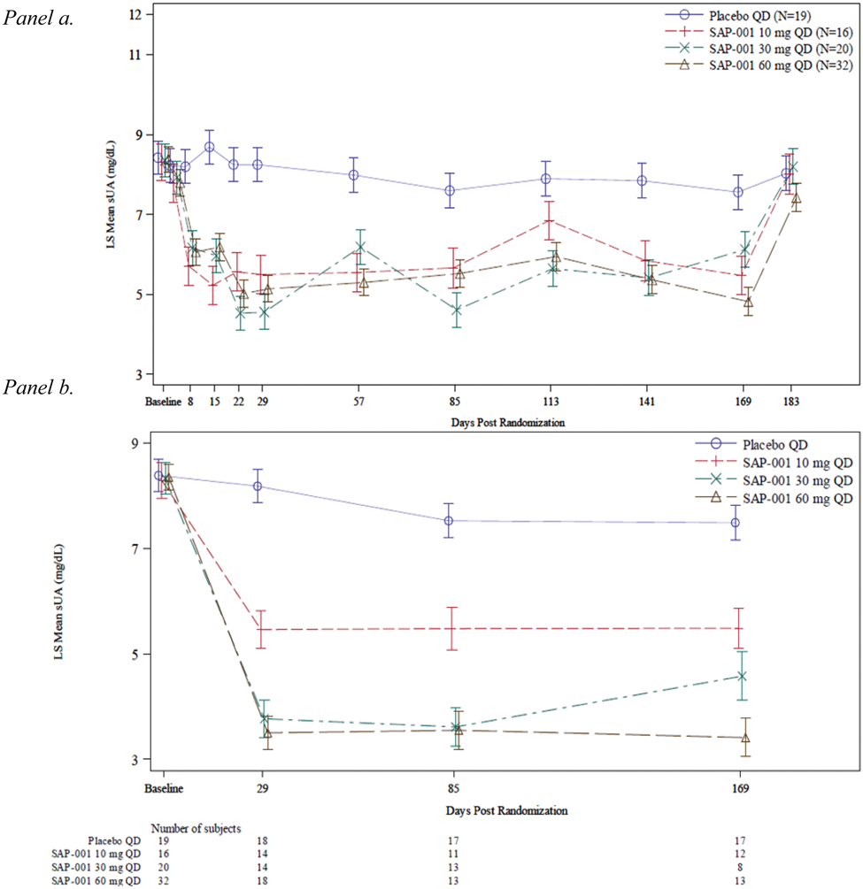 Panel a. Efficacy – Average sUA Over Time (Full Analysis Set)panel b. Efficacy – Average sUA Over Time (Subjects in the Full Analysis Set who were exposed to SAP-001 confirmed by PK analyses at the pre-dose at defined time points).