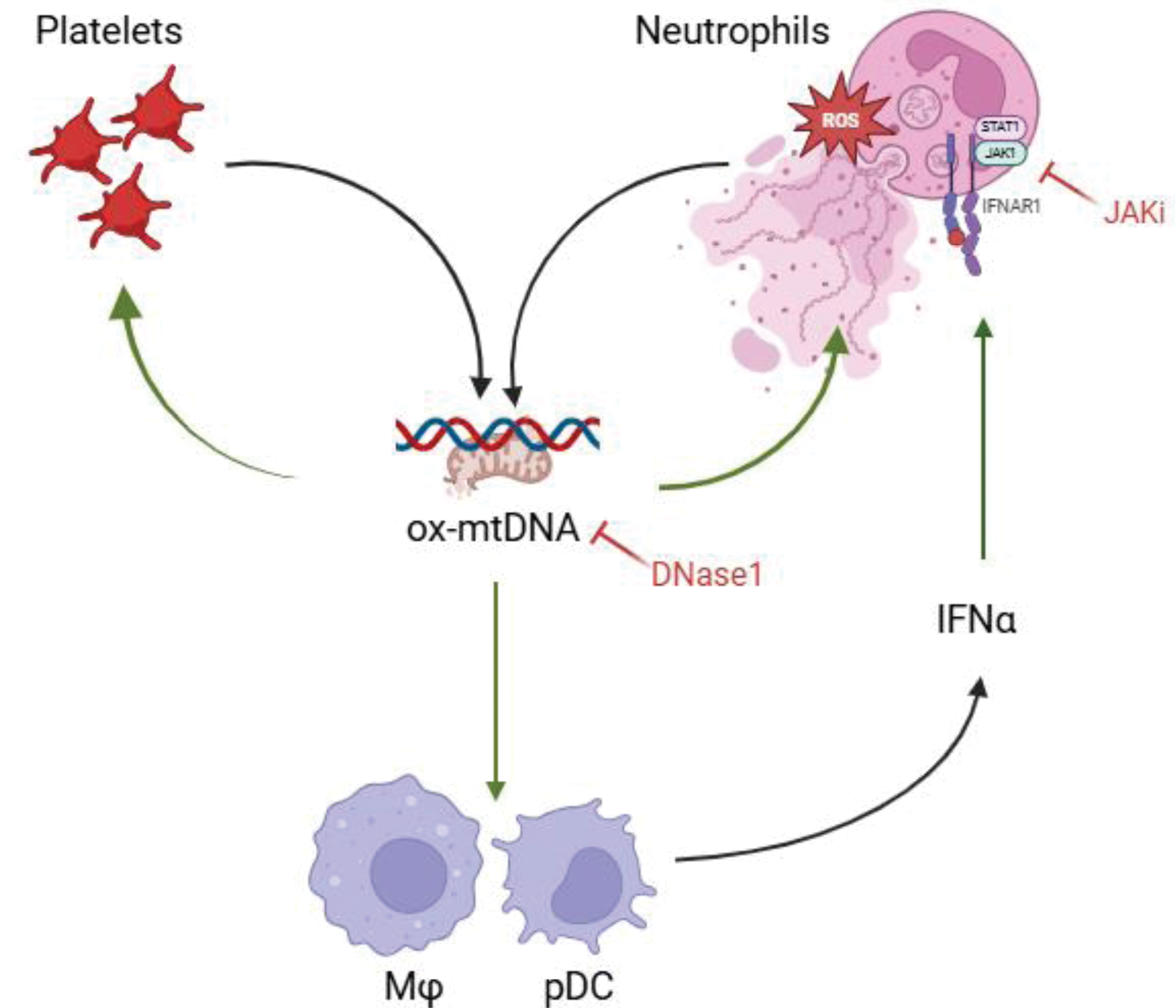Schematic representation of the feedback loop involving oxidized mtDNA, released from activated platelets and NETotic neutrophils, which amplifies inflammation during SSc pathogenesis. SSc neutrophils and SSc platelets are poised to release ox-mtDNA. SSc mtDNA in turn promotes its own release by excessive NET formation from HC neutrophils and platelets. SSc platelets are in an activated state and release high levels of CXCL4, a confirmed biomarker of SSc. The oxidized nature of this mtDNA renders it prointerferogenic. SSc blood cells are characterized by a pronounced ISG, while IFNa1 levels are elevated in SSc patients’ plasma. mtDNA copy numbers correlate with IFNa1 levels. DNase1 pre-treatment abolishes mtDNA-release and mtDNA oxidation induced by SSc plasma. Finally, IFN pathway blockade significantly inhibits NET formation and mtDNA oxidation.