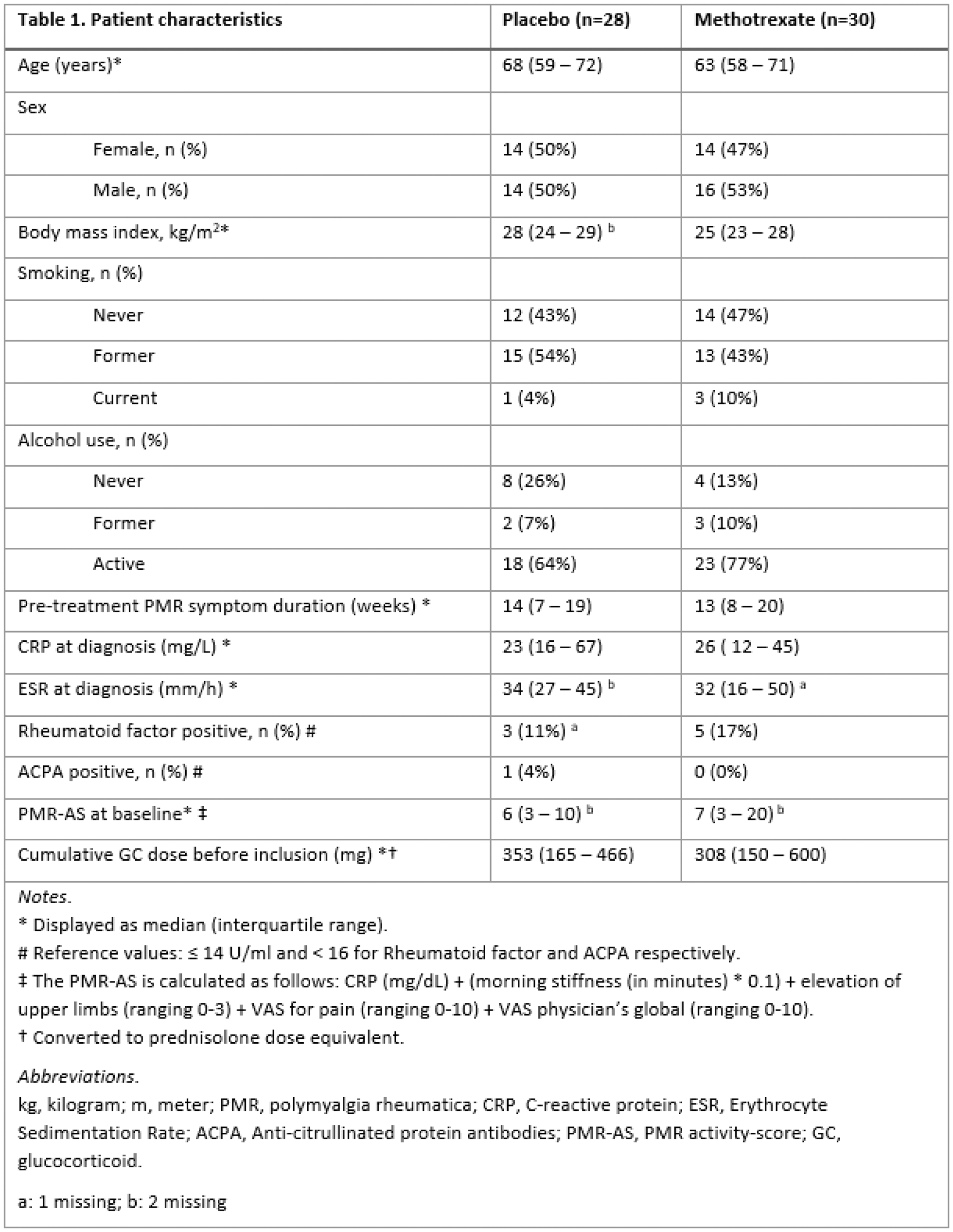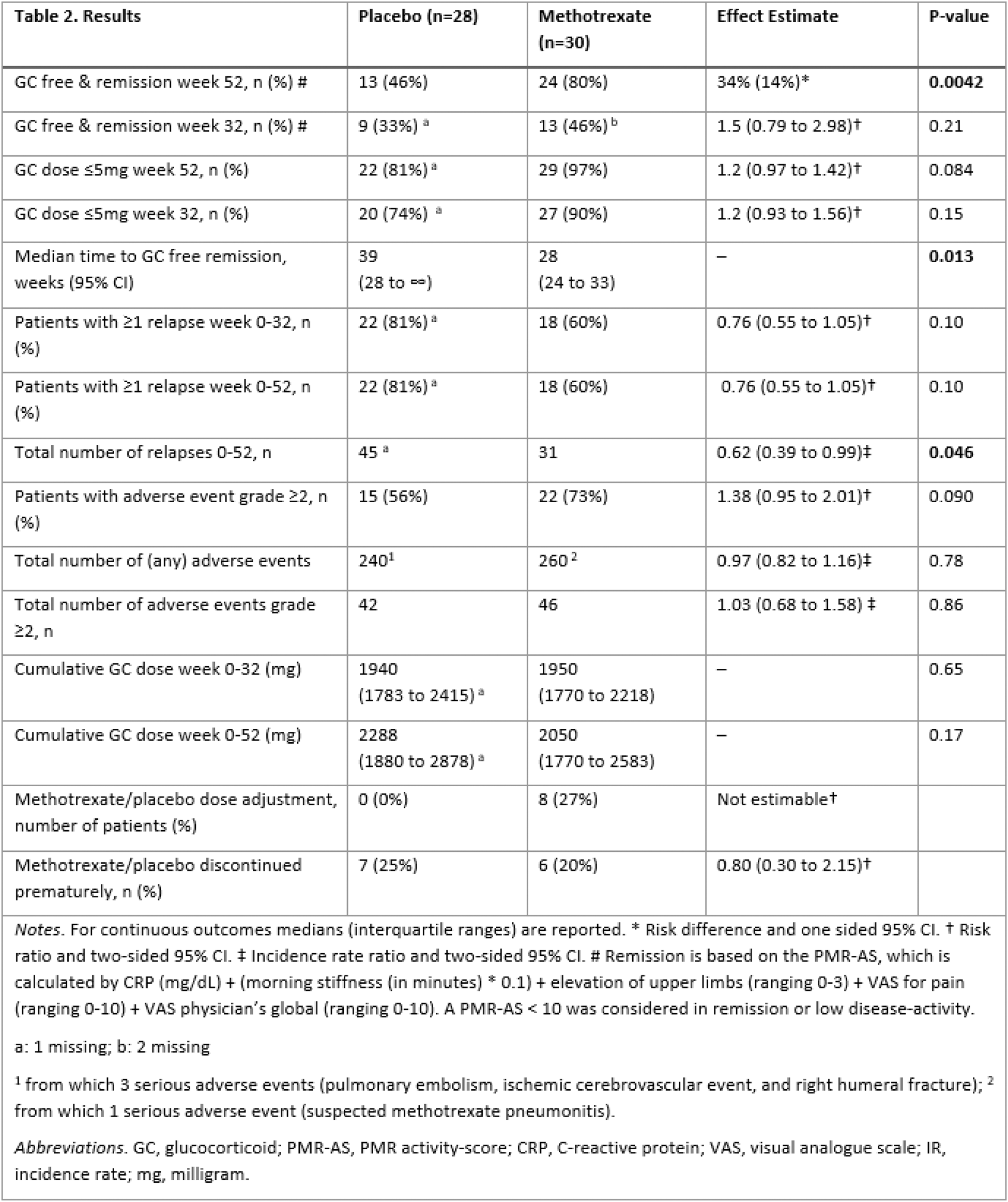 Background: Glucocorticoids (GCs) are the cornerstone of polymyalgia rheumatica treatment. However, inability to taper GCs poses a major challenge in treatment of PMR, and long-term GC use increases risk of infection, weight gain, osteoporosis, and diabetes, which highlights the need for GC-sparing alternatives in PMR. Methotrexate (MTX) is the most commonly used GC-sparing agent in PMR and is recommended in current guidelines as the first-choice GC-sparing agent in PMR patients prone to relapses or prolonged GC use [1]. Three previous RCTs have reported conflicting results [2-4], but used fairly low doses of MTX (7.5-10 mg weekly). There remains a need for more conclusive evidence of the efficacy of MTX in PMR, especially in a 25mg/week dose.