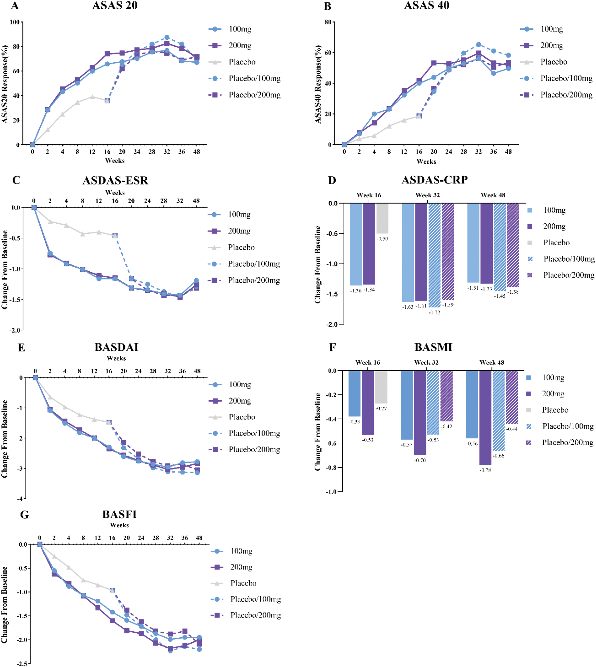 Clinical efficacy and disease activity outcomes for patients with ankylosing spondylitis (AS) treated with varying doses of Xeligekimab over 48 weeks. The results include ASAS20 (Assessment of Spondyloarthritis International Society 20% improvement criteria) and ASAS40 (40% improvement criteria) response rates, changes in ASDAS-ESR (Ankylosing Spondylitis Disease Activity Score based on Erythrocyte Sedimentation Rate) and ASDAS-CRP (based on C-Reactive Protein), as well as improvements in BASDAI (Bath Ankylosing Spondylitis Disease Activity Index), BASMI (Bath Ankylosing Spondylitis Metrology Index), and BASFI (Bath Ankylosing Spondylitis Functional Index).