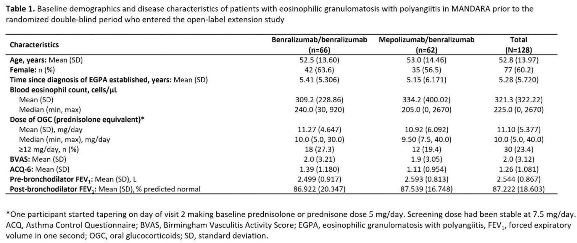 Methods: On completion of the double-blind period (n=136/140) comparing benralizumab 1x30mg versus mepolizumab 3x100mg subcutaneously every 4 weeks, patients could enter the OLE, during which they either continued benralizumab (benra/benra) or switched from mepolizumab to benralizumab (mepo/benra). Endpoints included remission (Birmingham Vasculitis Activity Score [BVAS]=0 and oral glucocorticoid [OGC] dose ≤4 mg/day), use of OGC, relapses, blood eosinophil count, 6-item Asthma Control Questionnaire (ACQ-6), pre-bronchodilator forced expiratory volume in 1 second (pre-BD FEV 1 ), BVAS, and safety.