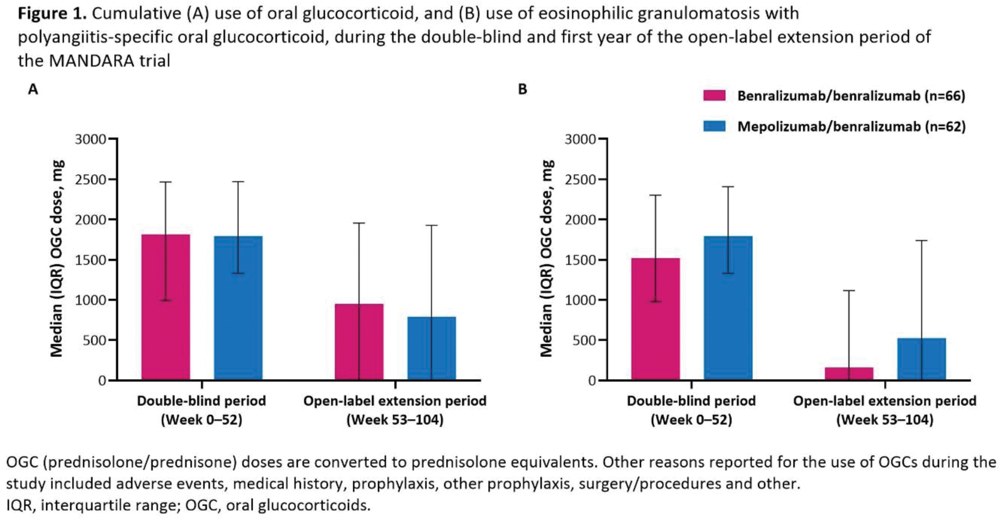 Results: In total, 128 patients entered the OLE (n=66 benra/benra, n=62 mepo/benra; mean age 52.8 years; 60.2% female); 119 completed OLE Year 1. Baseline characteristics of those entering the OLE were similar to those who entered the double-blind period (Table 1). At Week 104, 41 (62.1%) patients in the benra/benra group and 42 (67.7%) in the mepo/benra group achieved remission. During the first year of the OLE, 51 (77.3%) benra/benra, and 42 (67.7%) mepo/benra patients had no relapses. The percentage of patients in the benra/benra group who discontinued OGCs was similar at Weeks 49–52 (27 [40.9%]) and Weeks 101–104 (29 [43.9%]), while among the mepolizumab-treated patients who switched to benralizumab the percentage increased between Weeks 49–52 (16 [25.8%]) and Weeks 101–104 (27 [43.5%]). The median (IQR) OGC dose at Weeks 101–104 was 0.5 (0–5) mg/day in the benra/benra and 1.36 (0–5) mg/day in the mepo/benra group, corresponding to a median change from baseline of –96.7% and –90.5%, respectively. The median (IQR) cumulative use of OGC during the first year of the OLE was 950 (0–1955) mg and 791 (0–1928) mg in benra/benra and mepo/benra recipients respectively, while EGPA-related use of OGC was 159 (0–1114) mg and 523 (0–1739) mg (Figure 1). The median (IQR) blood eosinophil count in benra/benra-treated patients was 20 (10–40) cells/µL at both Weeks 52 and 100. Blood eosinophil count in the mepo/benra group reduced from 70 (40–90) cells/µL at Week 52 to 20 (10–50) cells/µL at Week 56, the first measurement after switching from mepolizumab to benralizumab. Mean (SD) change from study baseline in ACQ-6 scores were –0.78 (1.02) in the benra/benra group and –0.48 (0.96) in the mepo/benra group at Week 104. Mean (SD) change from study baseline in pre-BD FEV 1 was 0.03 (0.51) L and 0.02 (0.51) L in benra/benra- and mepo/benra-treated patients at Week 100, respectively. Mean (SD) change from study baseline in BVAS at Week 104 was similar between the benra/benra (–1.5 [4.16]) and mepo/benra (–1.6 [2.61]) patients. The most common adverse events during the double-blind and OLE periods were COVID-19, nasopharyngitis, and sinusitis. The safety of benralizumab was consistent with its known profile.