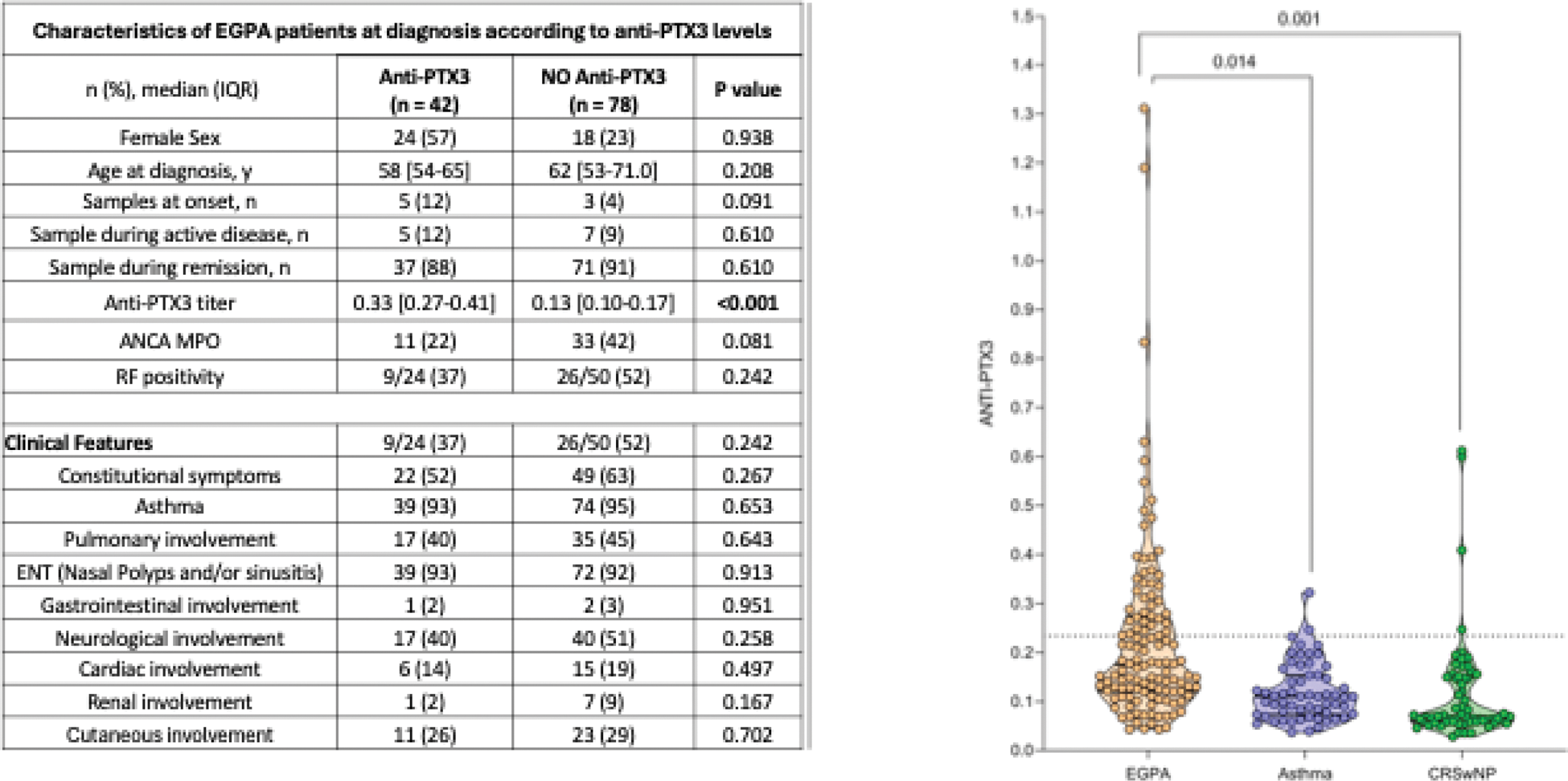 Results: A total of 120 patients diagnosed with EGPA were included, of whom 68 (56.7%) were female, with a median age of 61 years [54–69]. At the time of diagnosis, 44 (36.7%) patients were positive for ANCA, all with anti-MPO specificity. The control group consisted of patients with either eosinophilic asthma (n= 60, 41 females (68.3%), median age 59 [52-65] years) or CRSwNP (n= 63, 18 females (44.4%), median age 58 [48-67] years). Anti-PTX3 antibodies were detected in 42 (35%) out of 120 EGPA patients. The prevalence of anti-PTX3 antibodies was significantly higher in EGPA patients compared to those with asthma (42/120 35% vs 1/59 1.7%, p<0.001) and with CRSwNP (41/120 35% vs 3/63 4.8%, p<0.001), with p value comprehensive p < 0.001. Accordingly, median OD of anti-PTX3 resulted higher in EGPA than in asthma patients (0.14 [0.07–0.26] vs. 0.11 [0.07–0.15], p = 0.014) and CRSwNP patients (0.14 [0.07–0.26] vs. 0.07 [0.06–0.15], p = 0.001). The frequency of anti-PTX3 antibodies did not differ significantly based on ANCA status (25% in ANCA-positive patients vs. 40.8% in ANCA-negative patients, p = 0.801). No significant differences in anti-PTX3 antibody levels were observed based on clinical features at the time of diagnosis.