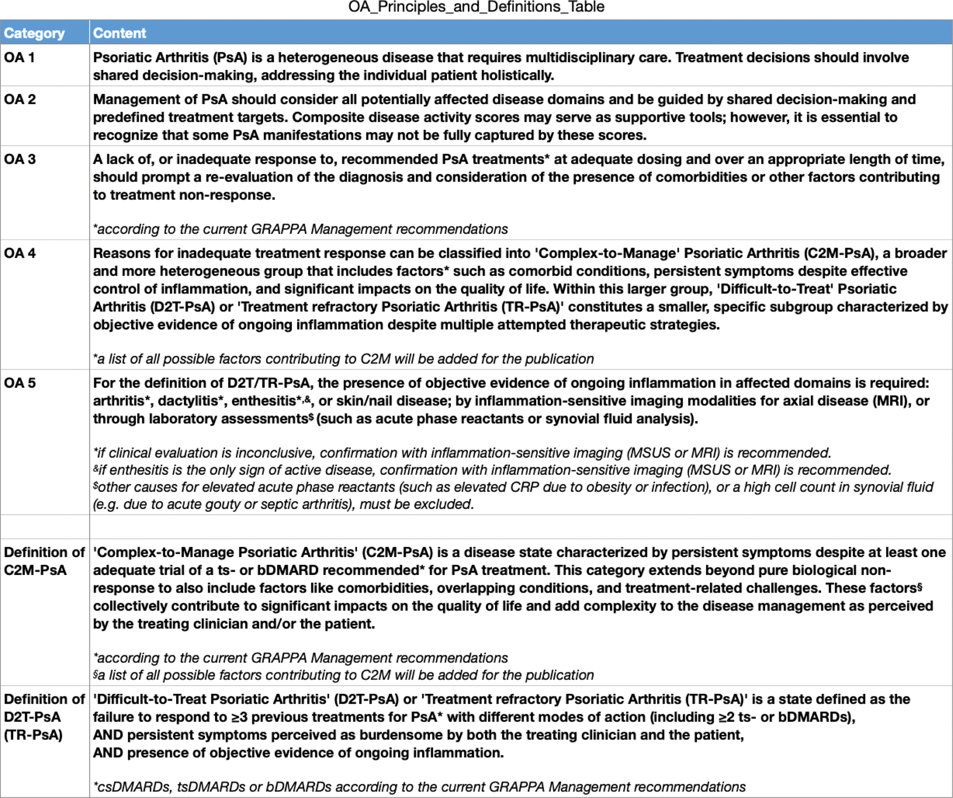 Conclusion: The GRAPPA initiative has established consensus definitions for D2T- and C2M-PsA, addressing critical gaps in PsA care. These definitions provide a framework for recognizing patients with persistent inflammation unresponsive to advanced therapies (D2T-PsA) and those facing broader management challenges, including comorbidities and psychosocial factors (C2M-PsA). By improving patient stratification, guiding clinical decision-making, and standardizing criteria for clinical trials, this work provides the foundation for advancing both research and clinical care, and potentially improve outcomes for patients with the most complex and refractory disease presentations in the future.