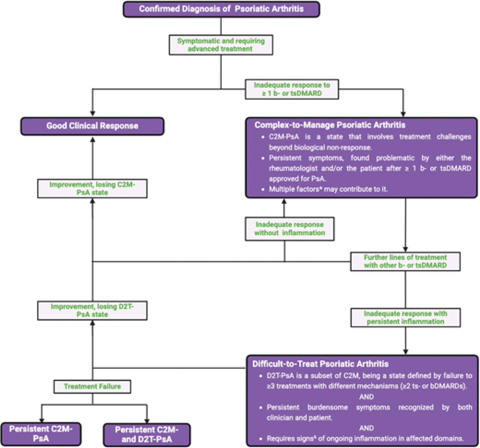 Algorithm of treatment failure in PsA with Complex-To-Manage PsA and Difficult-To-Treat PsA.