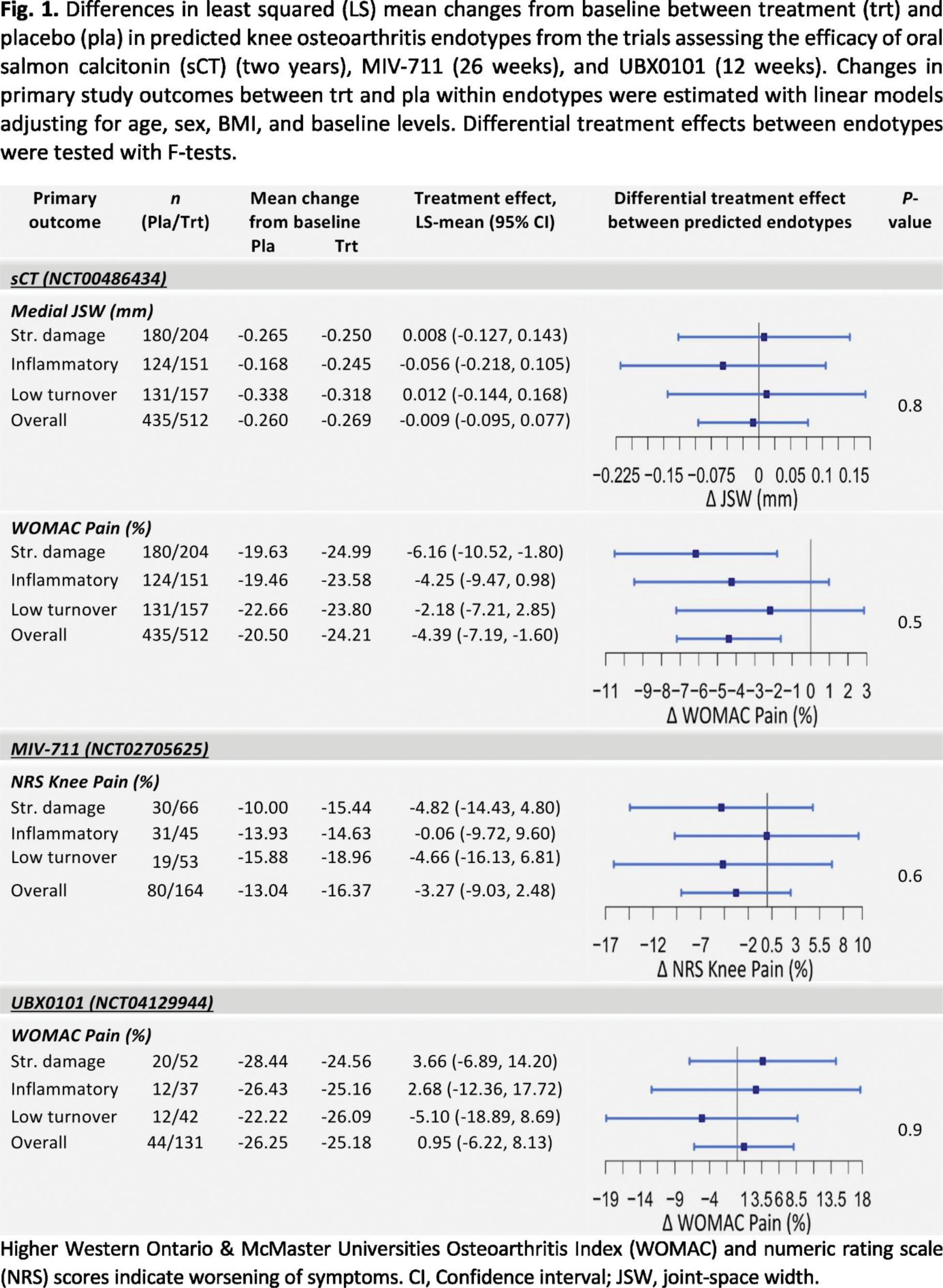 Results: The structural damage, inflammatory, and low tissue turnover endotypes were predicted at baseline in the MIV-711, sCT, and UBX0101 trials using a multi-class logistic regression model based on a panel of six biomarkers (Figure 1). Overall, the trials included did not provide strong evidence for differential treatment effect between the endotypes. A number of potential signals were observed. For MIV-711, the predicted structural damage and low tissue turnover endotypes showed the highest numerical 26-week reduction of numeric rating scale (NRS) knee pain for treatment compared to placebo. For sCT, only the predicted inflammatory endotype was associated with a numerically increased two-year loss of radiographic joint-space width for treatment compared to placebo, while the structural damage endotype was associated with a significant reduction of WOMAC pain for treatment compared to placebo. For UBX0101, only the predicted low tissue turnover endotype exhibited a numerical 12-week reduction of WOMAC pain in response to UBX0101 treatment.