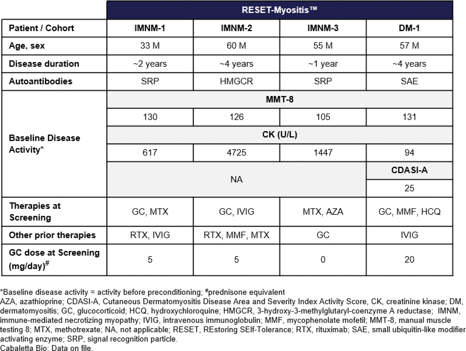 Results: 3 patients have been treated with rese-cel and have completed at least 1 month of follow-up in the RESET-Myositis TM trial, IMNM-1, IMNM-2 and DM-1 as of 16 December 2024. A fourth patient (IMNM-3) was recently dosed with rese-cel and others are anticipated in early 2025 (Table 1).