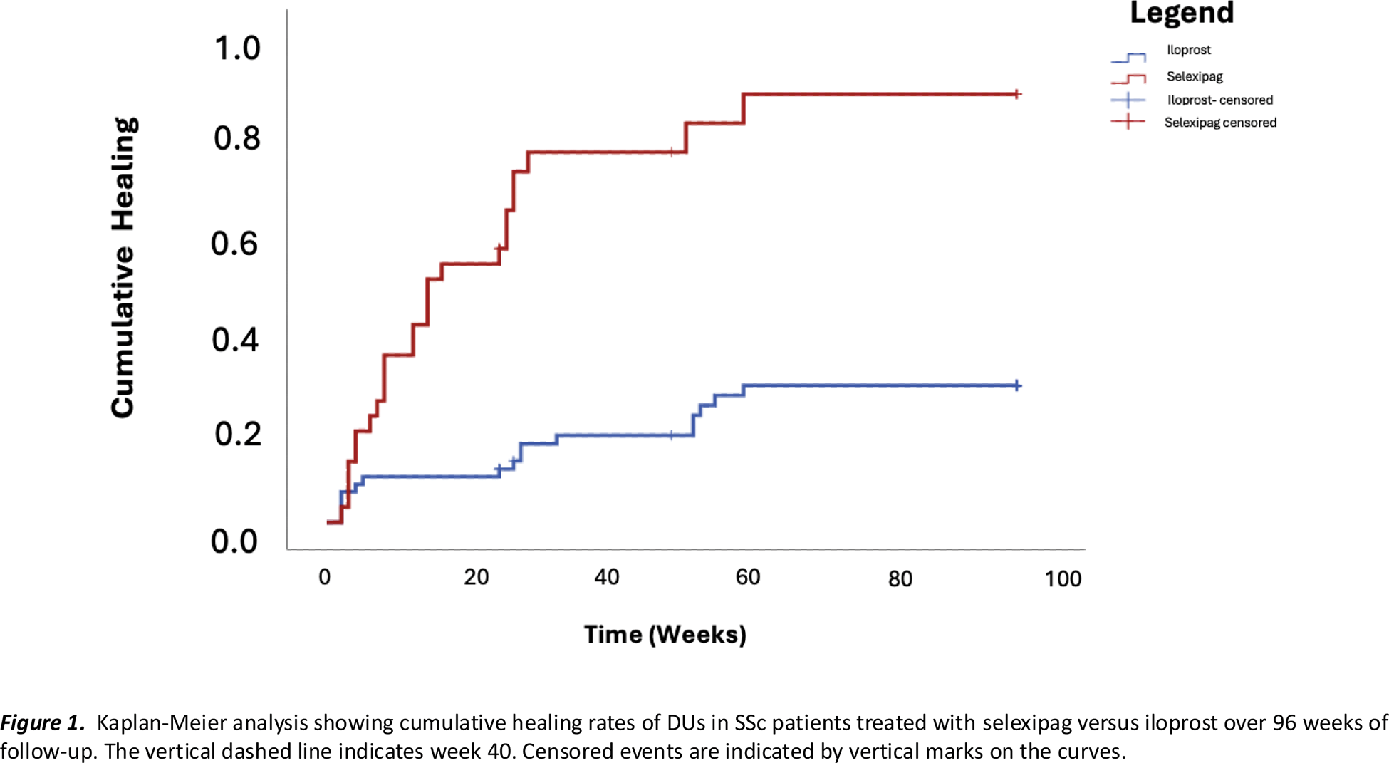 Methods: This retrospective multicentre study included 96 SSc patients with refractory DUs, 32 treated with selexipag (median dose of 1600 mg/day- IQR 1100 mg) and 64 with intravenous iloprost (0.5–2 ng/kg/min), matched for gender, disease subset, and age at diagnosis. Both groups were concomitantly treated with conventional vascular therapies (i.e. calcium channel blockers, endothelin receptor antagonists and phosphodiesterase 5- inhibitors). DUs number, ischemic pain and Raynaud phenomenon (RP) severity were assessed at baseline, 6, 12, and 24 months. Pain and RP were evaluated using Likert Pain Scale (LPS) and Raynaud Condition Score (RCS), respectively. Additionally, DUs recurrence and new onset were recorded. Healing rates were estimated using Kaplan-Meier analysis. Binary logistic regression was performed separately for both treatment groups to identify predictors of healing outcomes, including the following variables: age at diagnosis, age, sex, SSc subtype, latency between RP onset and the first digital ulcer, age at therapy, latency between ulcer onset and therapy administration, DUs number at baseline, LPS at baseline, and RCS at baseline.