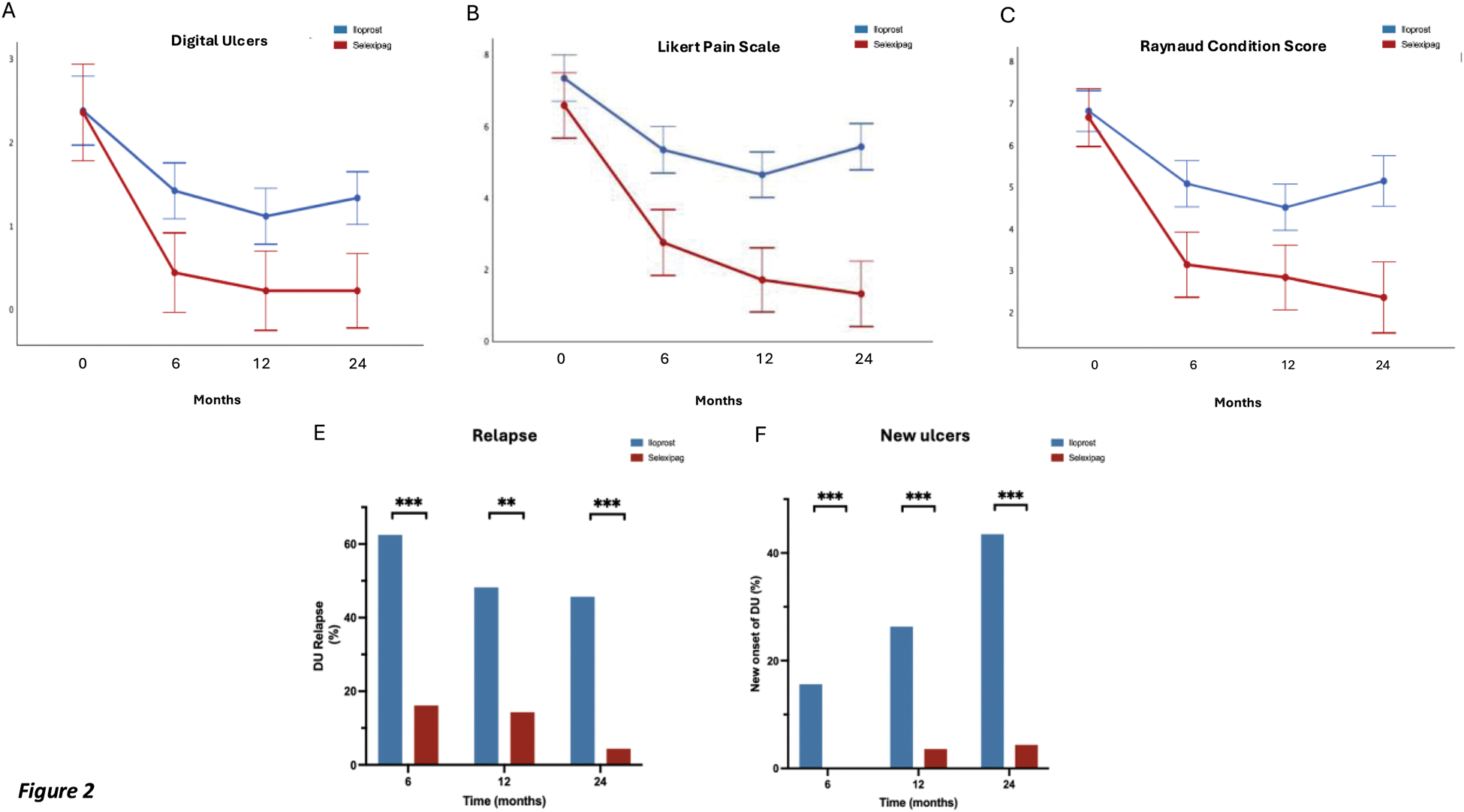 Results: DUs healing rate was significantly higher in selexipag-treated patients in comparison with iloprost-treated ones (87% vs 28%) at 96 weeks, with the formers achieving faster healing (75% vs 18% by week 40) (p<0.001) (Figure 1). DUs number, RCS and LPS scores showed significant improvement in selexipag-treated group compared to iloprost (p<0.001 for all) throughout the 24-month follow-up (Figure 2 A-B-C). Repeated measures analysis demonstrated significant changes over time for all three outcomes. The difference in treatment effect was supported by Mann-Whitney U analyses, showing comparable baseline measures (DUs: p=0.901; RCS: p=0.561; LPS: p=0.708) significant differences emerged by 6 months (DUs: p=0.001; RCS: p<0.001; LPS: p<0.001) and were maintained through 12 and 24 months (all p<0.001). Additionally, selexipag-treated patients experienced significantly lower relapse rates (5% vs 45% at 24 months, p<0.001) (Figure 1D). Consistently, DUs formation remained lower with selexipag (5% vs 40% at 24 months, p<0.001) (Figure 1F).Binary logistic regression revealed that in the iloprost group, baseline ulcer count showed a negative association with healing probability (OR=0.364, 95% CI: 0.147-0.904, p=0.029), while baseline pain score demonstrated a positive association (OR=2.376, 95% CI: 1.198-4.710, p=0.013). In contrast, the selexipag group analysis showed no statistically significant predictors, with baseline ulcer count (OR=0.562, 95% CI: 0.244-1.298, p=0.177) and pain score (OR=1.302, 95% CI: 0.715-2.370, p=0.389) remaining non-significant. Only two patients had to discontinue selexipag for mild intolerance after 12 months of treatment.