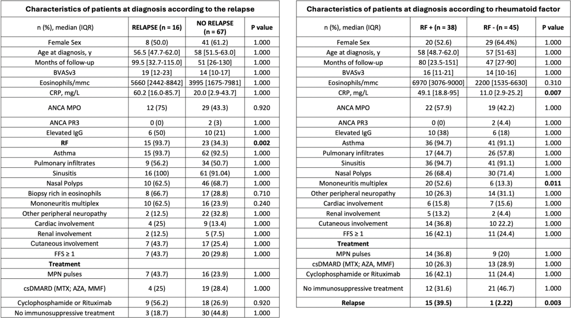 Results: A total of 83 patients classified with EGPA according to the 2022 ACR/EULAR classification criteria were included: 38 were RF positive (RF+) and 45 were RF negative (RF-) at diagnosis. The median follow-up was 80 [IQR: 23.5-151] months for the RF+ group and 47 [27-90] months for the RF- group, with no significant difference between the groups (p=1.000). At diagnosis, the groups significantly differed in CRP levels (49.1 [18.8-95] vs. 11.0 [2.9-25.2], p=0.007) and the presence of mononeuritis multiplex (20 [52.6%] vs. 6 [13.3%], p=0.011). The RF+ group had a significantly higher vasculitic relapse rate compared to the RF- group (15/38 [39.5%] vs. 1/45 [2.2%], p=0.003). The median time to relapse was 29 [11.8-71.8] months. Notably, patients in the RF+ group more frequently received methylprednisolone pulses (14 [37.8%] vs. 9 [18.3%]) and cyclophosphamide and/or rituximab (16 [43.2%] vs. 11 [22.5%]) at baseline compared to the RF- group. The study revealed that 67 patients did not experience any relapse, while 16 patients experienced at least one relapse. The Random Forest model, applied to the cohort of 83 patients (67 non-relapsers and 16 relapsing), identified the variable RF (VIMP 0.2031, 95%CI -0.012 to 0.307) as the most significant predictor of relapse, contributing significantly to the model, despite the wide confidence interval, suggesting some variability at the lower end. Variables like ANCA (VIMP 0.0656, 95%CI 0.016 to 0.160) and age at disease onset (VIMP 0.0530, 95%CI 0.009 to 0.155) were identified as moderately important predictors. Conversely, elevated IgE (VIMP 0.0203, 95%CI 0.002 to 0.056) and elevated IgG (VIMP 0.0124, 95%CI -0.050 to 0.077) had minimal impact on the model’s predictive performance of relapse. The model attained a sensitivity of 96.3%, a specificity of 89.3%, and an F1 score of 88.1%. The misclassification rate was 21.7%, with an AUC of 0.8078, indicating a strong ability of the model to distinguish between the two classes (relapse vs. non-relapse). When evaluating the contribution of each feature to the prediction using the Shapley value (phi) method, the absence of RF strongly increased the predicted probability of being a non-relapser (phi +0.1469). The presence of ANCA and older age at disease onset slightly increased the likelihood of relapse (phi -0.0270 and -0.0133, respectively). Features such as extravascular eosinophilic inflammation on biopsy and elevated total serum IgG also contributed positively, though their influence was relatively minor (phi +0.0178 and +0.0193, respectively). Elevated serum IgE had only a minimal effect on the prediction (phi -0.0007).