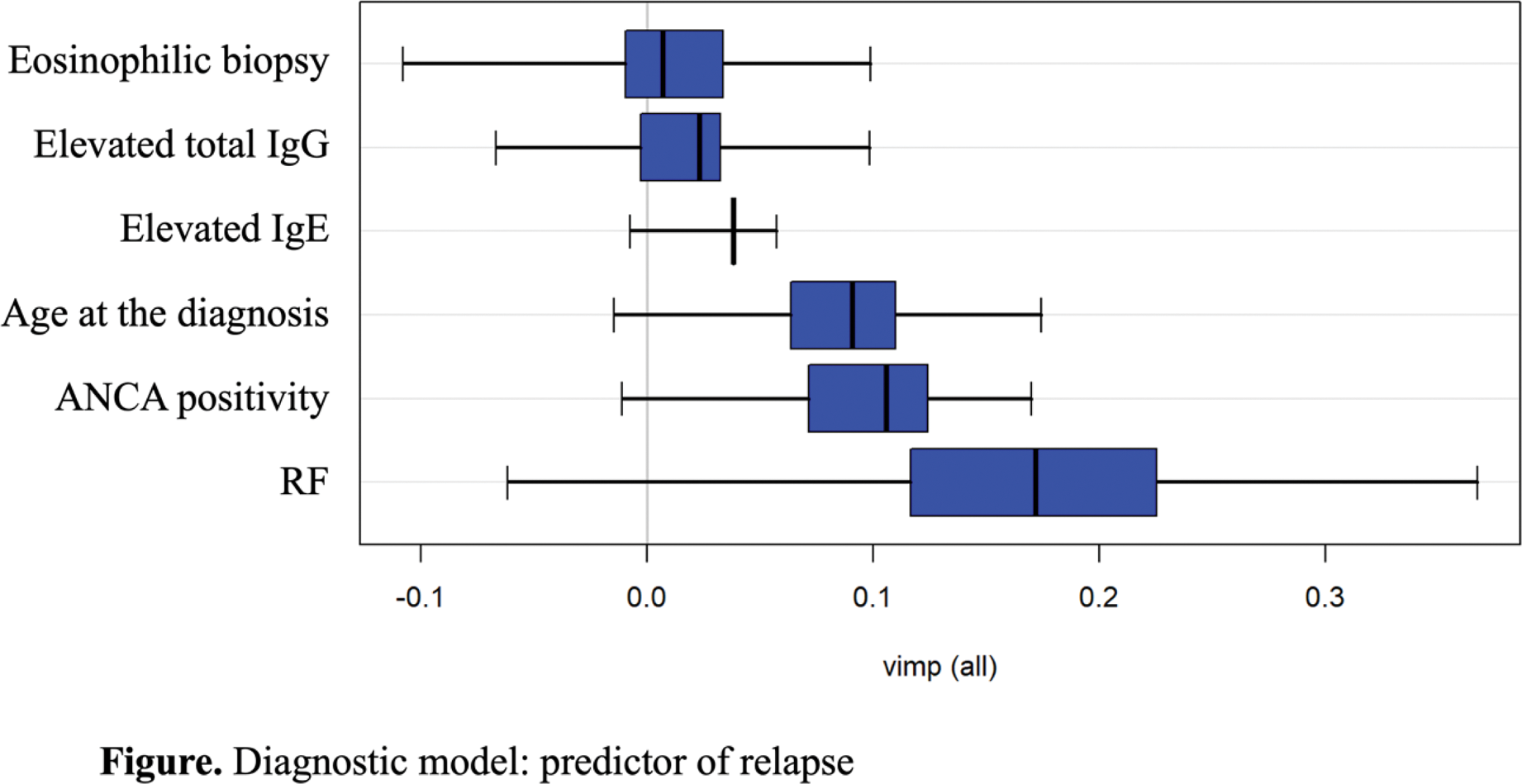 Conclusion: This study highlights the significant prognostic role of RF in predicting vasculitic relapses in EGPA patients. The random forest model identified RF presence as the most important relapse predictor, with a high variable importance score, despite some variability in its confidence interval. Other moderately important predictors included ANCA positivity and age at disease onset. RF positivity at diagnosis is a critical prognostic factor for relapse, highlighting the importance of early identification and tailored treatment strategies for RF-positive patients.