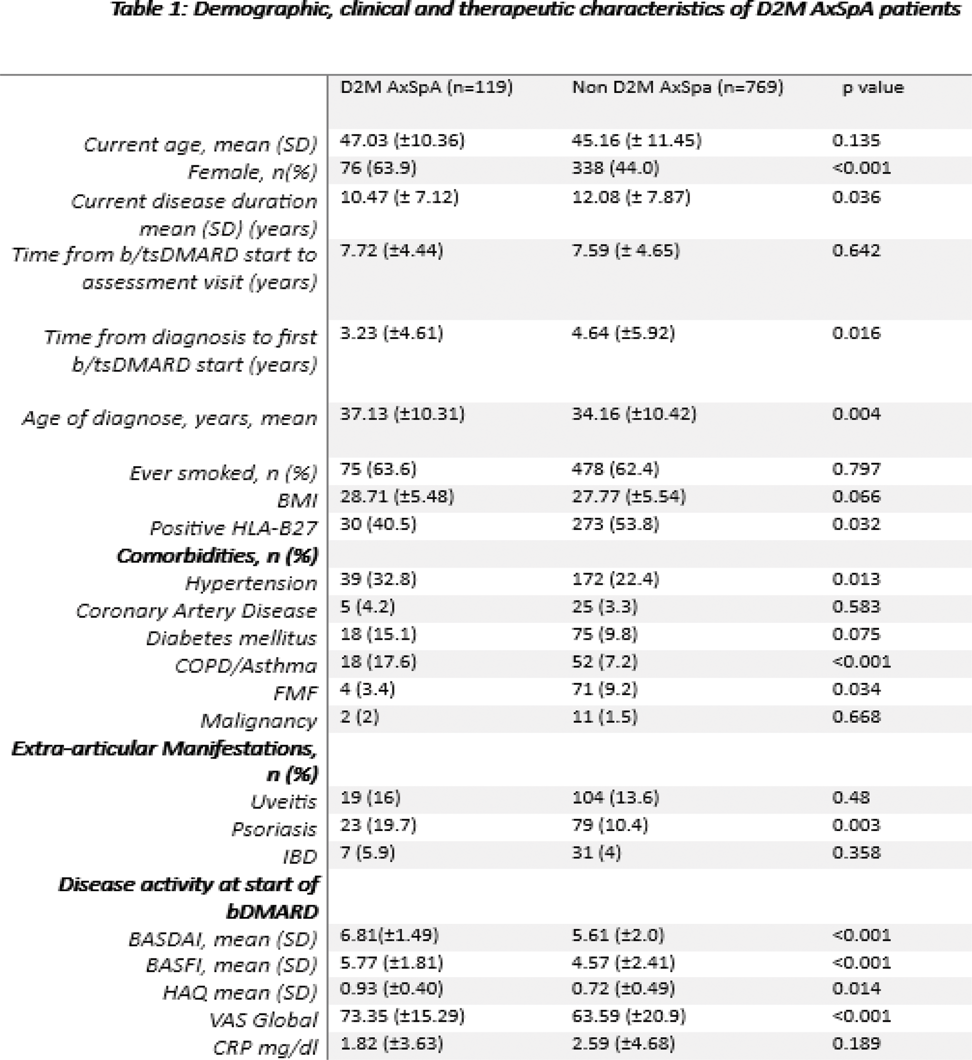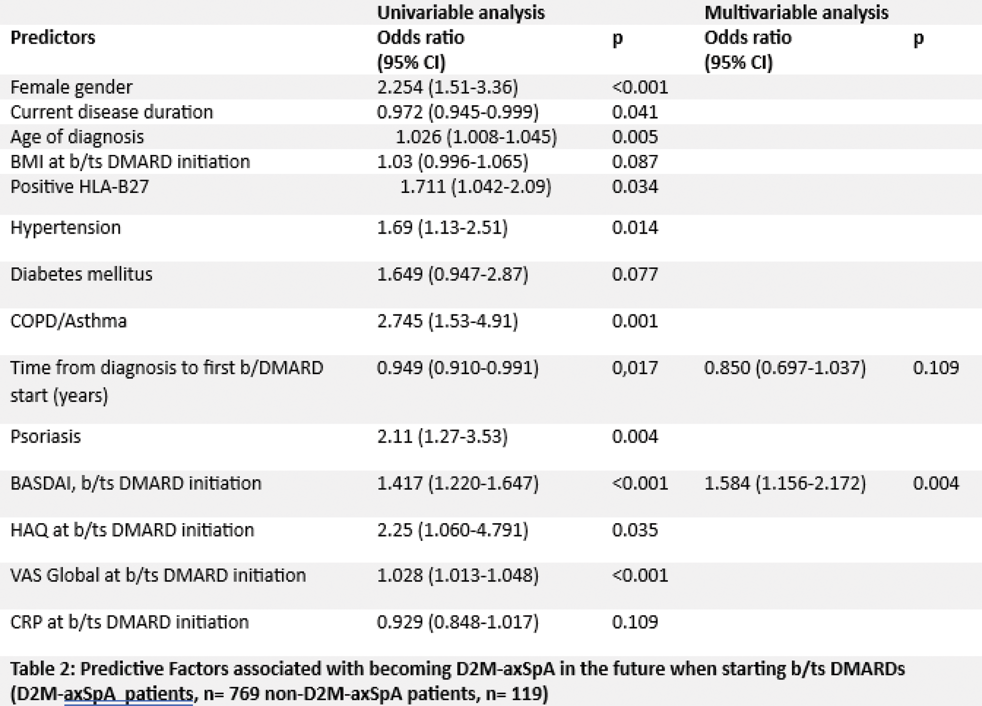 Conclusion: There are nearly 13% of patients determined as D2M in our biological cohort. D2M axSpA was associated with higher disease activity at start of b/DMARD, comorbidities, extra-articular manifestations and female gender. Higher BASDAI score at start of the b/DMARD seems to be an independent factor to predict D2T-AxSpa.