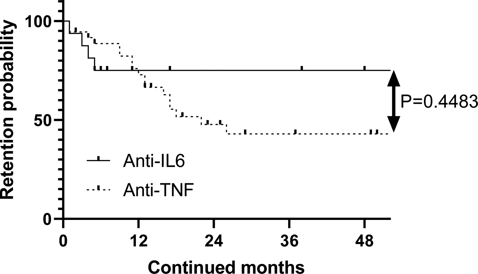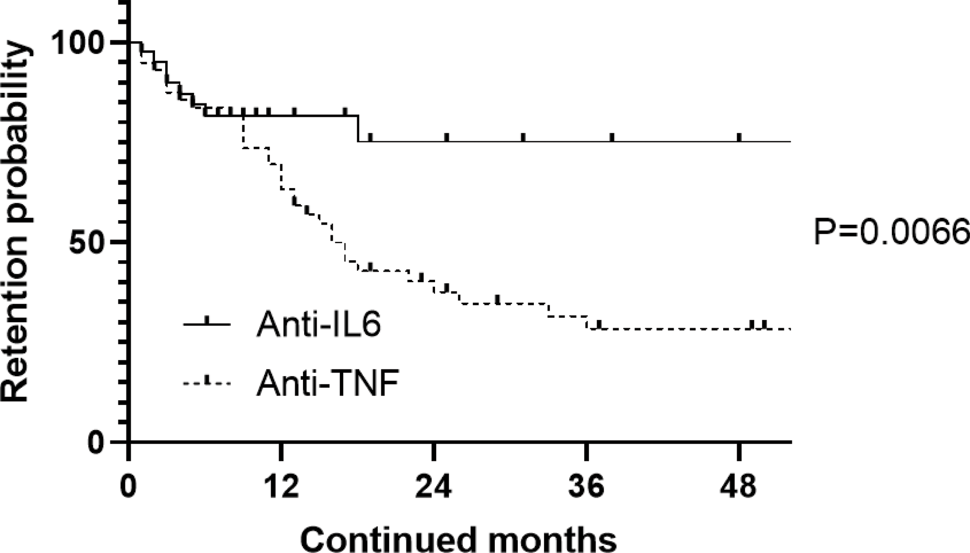 Results: Among 183 RP patients, 110 required immunosuppressive therapy. Biologic agents were used in 62 refractory cases, with a mean age of 48 years, 56.5% female, and 44 cases (71.0%) presenting with airway involvement. TNFα inhibitors were used in 44 of 70 patients (62.9%), IL-6 inhibitors in 42 of 53 patients (79.3%), and CD20 inhibitors in 4 patients, all showing efficacy. Continuation rates were significantly higher for IL-6 inhibitors than for TNFα inhibitors (p=0.006, Figure 1). However, within the first year, dropout rates were higher for IL-6 inhibitors than for TNFα inhibitors (Figure 2). These findings suggest that IL-6 inhibitors are essential for long-term maintenance therapy, while TNFα inhibitors are more effective in the induction phase. Approximately 46% of patients achieved GC-free status during long-term follow-up, with 7 patients (10.0%) in the TNFα inhibitor group, 19 patients (35.8%) in the IL-6 inhibitor group, and 1 patient in the CD20 inhibitor group. The mean time to achieve GC-free status was 581.5 days.