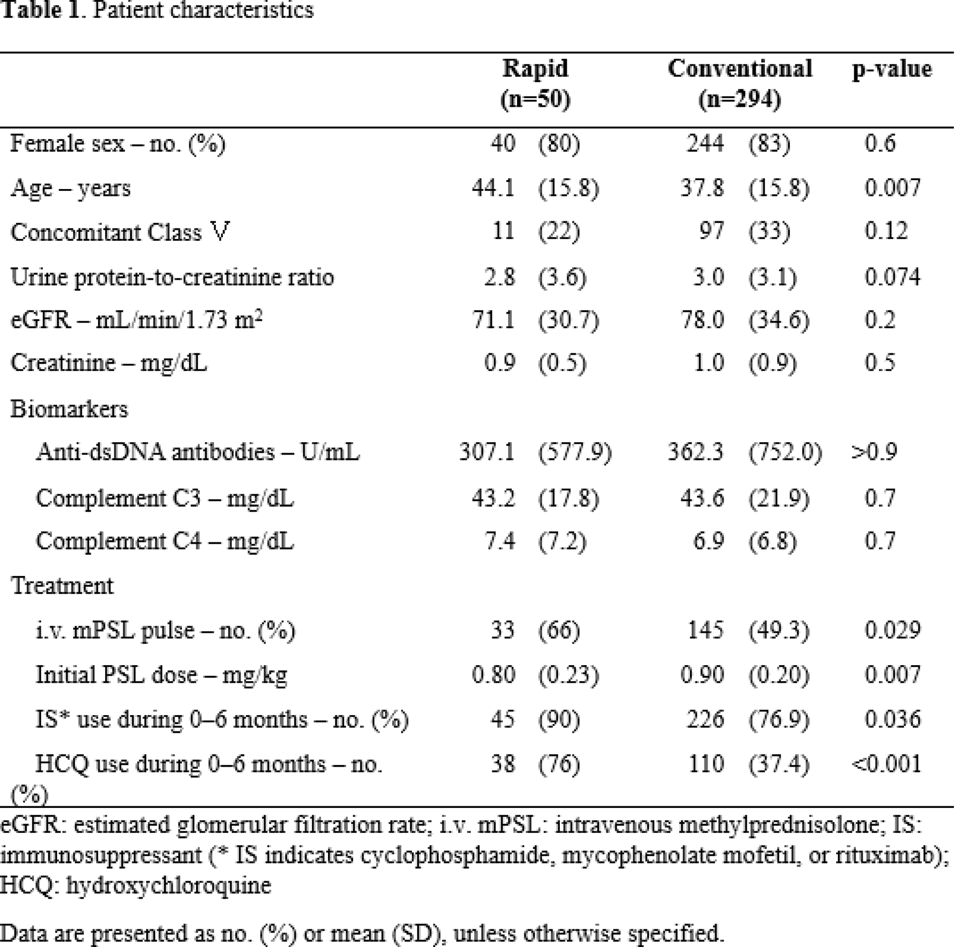Results: A total of 344 patients from 17 centres were included: 50 rapid GC reducers and 294 conventional GC reducers. PRR at 12 months was achieved by 43/50 (86%) in the rapid GC group and 248/294 (84.4%) in the conventional group. After adjusting for age, initial UPCR, initial estimated glomerular filtration rate, initial GC dose, use of methylprednisolone pulse therapy, strong immunosuppressants (mycophenolate mofetil, cyclophosphamide, or rituximab), and hydroxychloroquine, no significant difference was observed in PRR and CRR at 12 months (p = 0.760, 0.483, respectively). Recurrence rates and serious adverse events over 2 years of follow-up were also comparable between the groups.