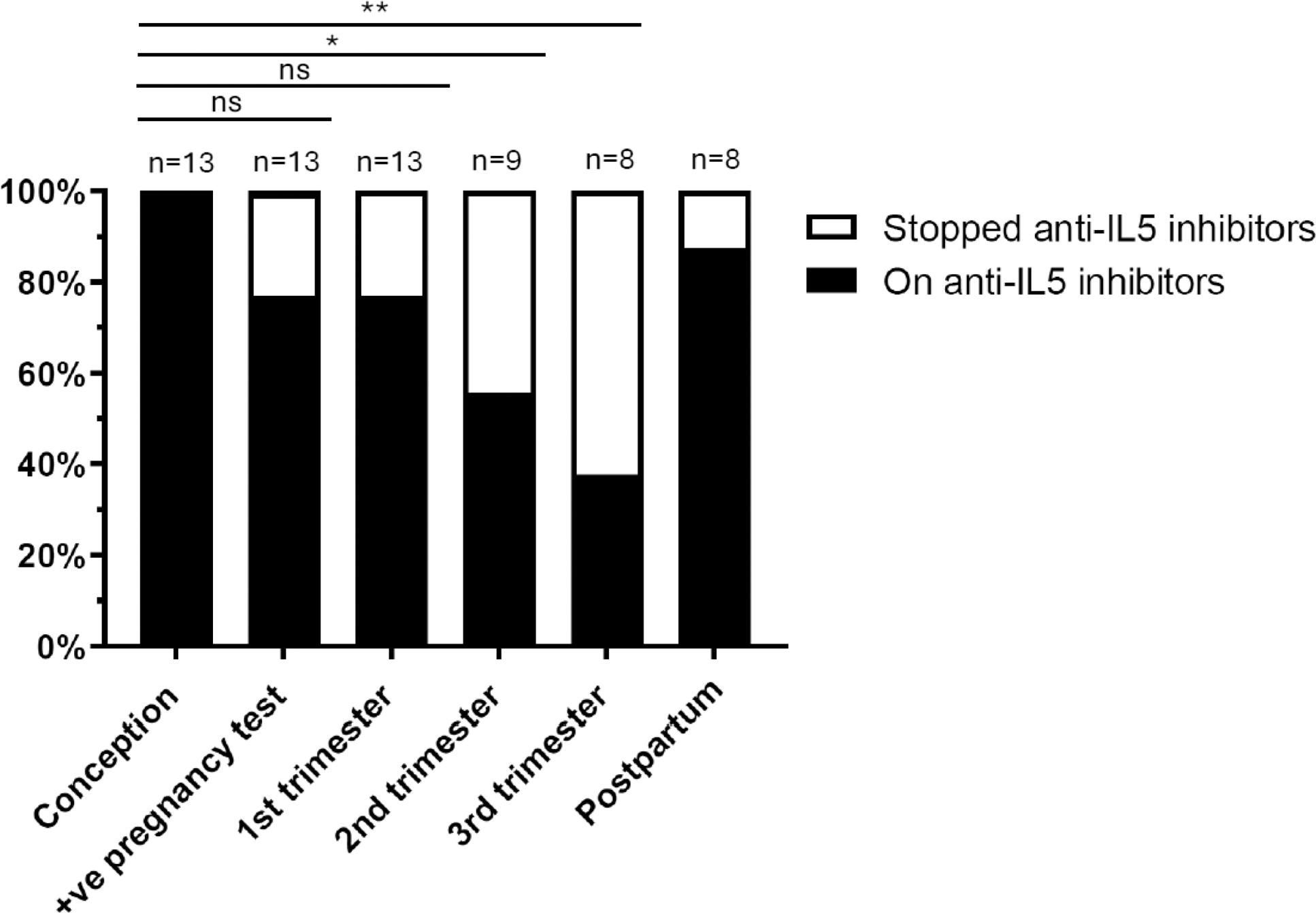 Results: The data of 13 pregnancies (one still ongoing, at 2 nd trimester) from 10 patients were enrolled, 2 affected by EA, 3 by HES and 5 by EGPA (all ANCA-negative, median BVAS at onset 14 (IQR 9, 18.5)). The median age at ED diagnosis was 28 (IQR: 26, 28.75) years old. Before the pregnancies under IL-5i exposure, all women had at least one pregnancy (median 2 (IQR: 1, 3.25)) and one delivery (median 1 (IQR: 1, 1.25)), with 40% of these with previous pregnancy complications. None of them had significant comorbidities, other systemic autoimmune disorder, or antiphospholipid syndrome, while one was an asymptomatic Lupus Anticoagulant (LAC) carrier. Of the 13 pregnancies, all women were on IL-5i at conception (11 in mepolizumab with 54% at 300mg/month; 2 in benralizumab at 30mg/month), 3 of them stopped mepolizumab at positive pregnancy test. At conception, 3 women (23%) were on GC (median dose 5 mg/day (IQR: 0, 12.5)), whereas none were on additional immunosuppressive agents. In 31% of the pregnancies, the ED was deemed as active by clinicians at first assessment. In 15% of the pregnancies, asthma was uncontrolled in the month before positive pregnancy test. No relapse of the ED during pregnancy was observed, nor GC was increased or started during the pregnancy course to control ED. Among the completed pregnancies, in 43% (3/7) of cases, ED were deemed as active in postpartum (1 HES, 2 EGPA), with 2 patients with EGPA being active from the beginning. Of note, in all these patients IL-5i were discontinued during pregnancy (two in 1 st trimester, one in 2 nd trimester). Adverse pregnancy outcomes (APOs) occurred in 38% (5/13) of pregnancies: pregnancy loss in 38% (4 pregnancy losses in 3 women before 10 th gestational week (GW), and 1 therapeutic abortion at 18 th GW for fetal malformation), maternal complications in 14% (gestational diabetes). No neonatal deaths, preterm deliveries, and small-for-gestational-age neonates were reported. In all cases, APOs were not considered as drug-related (physician’s judgment). Of note, among the 3 patients with early pregnancy loss, one was LAC carrier and 2 had a healthy pregnancy under IL-5i. In the woman with therapeutic abortion, the same fetal malformation was already reported in a previous pregnancy before HES diagnosis. When pregnancy outcomes were stratified by eosinophilic disorder type and disease activity (active vs non active), use of GC, maternal age, IL-5i type at conception, no difference was observed (p>0.05 in all the comparisons). Compared to the conception timepoint, 77% (10/13) of patients were still on IL-5i at the time of the positive pregnancy test and during the 1st trimester, 56% (5/9) during the 2 nd trimester (p=0.0172), and 38% (3/8) during the 3 rd trimester (p=0.0028). The reason for discontinuation of IL-5i was for concerns about lack of data in pregnancy. After delivery, 87.5% were on treatment (4 patients started again the IL-5i) (Figure 1).