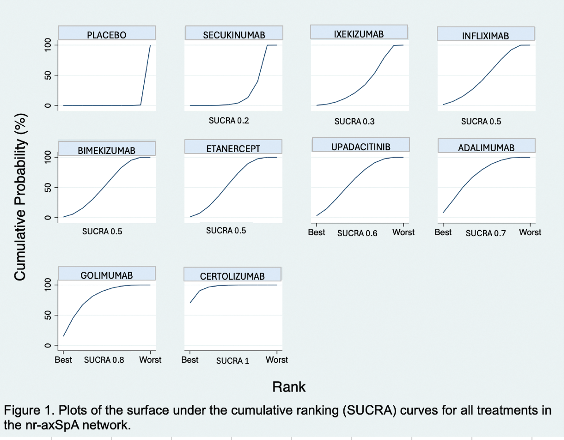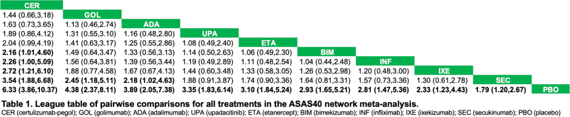Results: We identified 14 RCTs enrolling 2,523 patients with active nr-axSpA with inadequate response/intolerance to NSAIDs. A total of 45 pairwise comparisons were analyzed, including 9 direct comparisons of 9 interventions. All active therapies significantly improved ASAS40 response rates compared to placebo (Table 1). Certolizumab (OR 6.33, 95% CrI 3.86–10.37) and golimumab (OR 4.38, 95% CrI 2.37–8.11) were the most effective therapies, followed by adalimumab (OR 3.89, 95% CrI 2.05–7.38). The ranking probabilities based on the SUCRA indicated that certolizumab (SUCRA = 1.0), golimumab (SUCRA = 0.8), and adalimumab (SUCRA = 0.7) were the optimal therapies with the highest probability of achieving the best outcomes. Upadacitinib, etanercept, bimekizumab and infliximab were good (SUCRA 0.6–0.5) and ixekizumab and secukinumab (SUCRA <0.4) were considered effective compared to placebo (Figure 1).