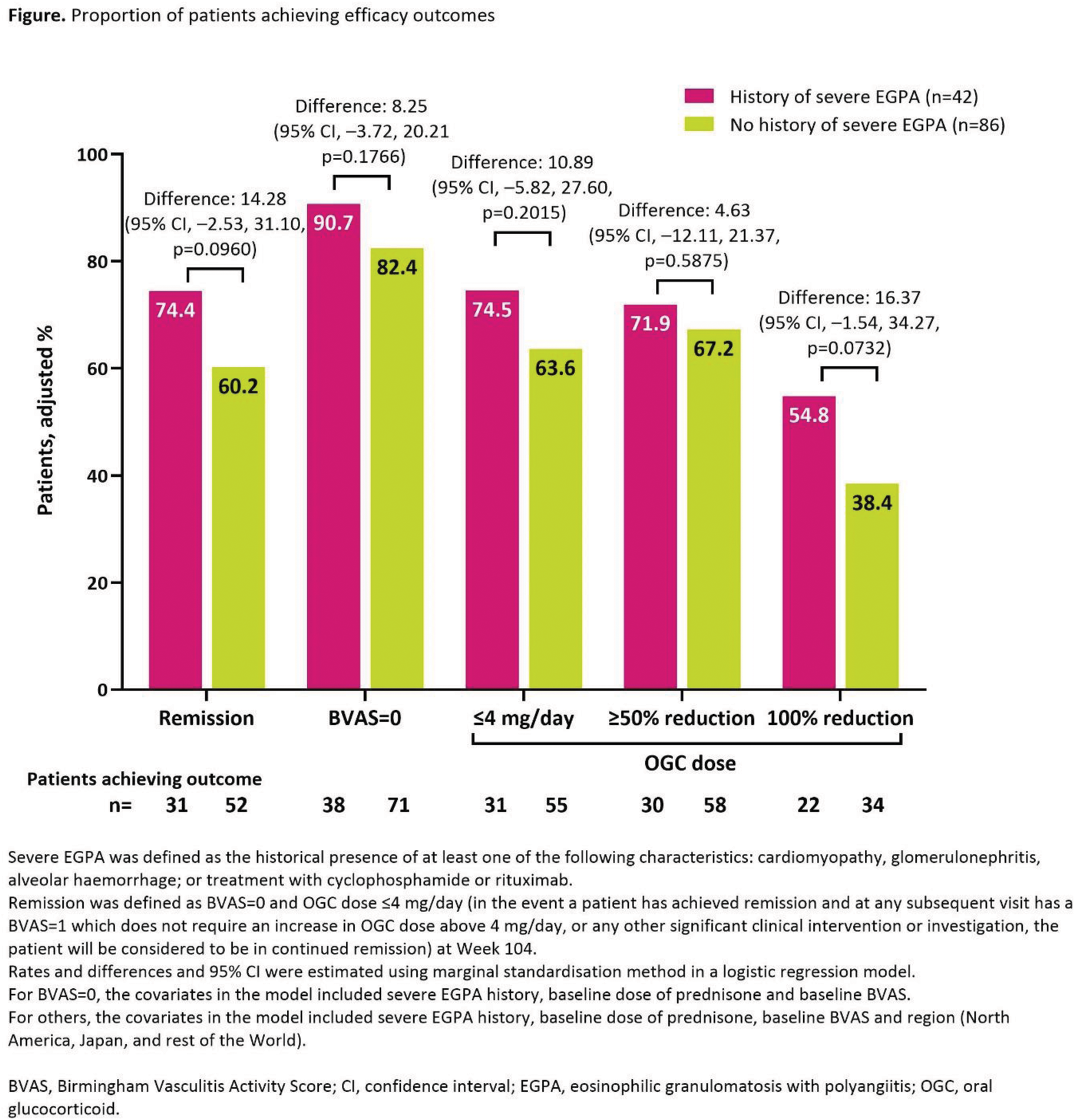 Results: Of 128 patients who entered the OLE, 42 (32.8%) had a history of severe EGPA (24 benra/benra, 18 mepo/benra) and 86 (67.2%) had no history of severe EGPA (42 benra/benra, 44 mepo/benra). A higher proportion of patients with a history of severe disease received non-OGC immunosuppressive therapy since diagnosis (severe EGPA: 32 [76.2%], non-severe EGPA: 45 [52.3%]) and had 3–5 relapses (severe EGPA: 14 [33.3%], non-severe EGPA: 12 [14.0%]) in the two years before study entry. A similar proportion of patients in both groups were ANCA-positive (severe EGPA: 12 [28.6%], non-severe EGPA: 23 [26.7%]). Similar adjusted rates of remission were achieved at Week 104 regardless of history of disease severity (severe EGPA: 74.4%, non-severe EGPA: 60.2%; difference: 14.28 [95% confidence interval (CI): –2.53, 31.10], p=0.0960; Figure 1). The adjusted rates for achieving remission by Week 24 and remaining in remission until Week 104 were also similar between groups (severe EGPA: 28.9%, non-severe EGPA: 20.9%; difference: 7.98 [95% CI: –7.52, 23.47], p=0.3129). During Weeks 101–104, a similar proportion of patients in the severe and non-severe EGPA groups had a ≥50% reduction from baseline in OGC dose (severe EGPA: 71.9%, non-severe EGPA: 67.2%; difference: 4.63 [95% CI: –12.11, 21.37], p=0.5875) and 54.8% versus 38.4%, respectively, had full withdrawal of OGCs (difference: 16.37 [95% CI: –1.54, 34.27), p=0.0732). Adverse events and serious adverse events were similar between groups regardless of disease severity (Table 1).