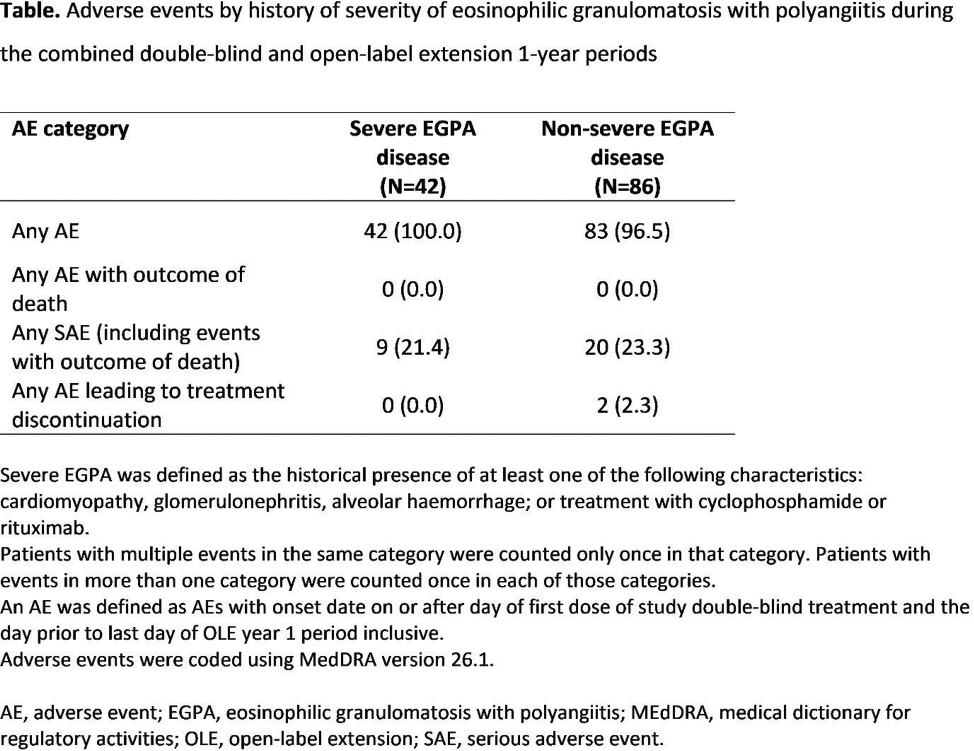 Methods: Patients who completed the double-blind period were invited to enter the OLE during which they continued benralizumab (benra/benra, n=66) or switched from mepolizumab to benralizumab (mepo/benra, n=62). Endpoints at Week 104 included remission (Birmingham Vasculitis Activity Score [BVAS]=0 and oral glucocorticoid [OGC] dose ≤4 mg/day), OGC use, and safety. Data from both groups were pooled to evaluate these endpoints according to the presence/absence of a history of severe EGPA prior to study baseline. The ‘severe EGPA group’ included patients with historic presence ever of at least one of the following: cardiomyopathy, glomerulonephritis, alveolar haemorrhage; or treatment with cyclophosphamide or rituximab. As per the exclusion criteria, no patients had severe manifestations of EGPA at trial entry.