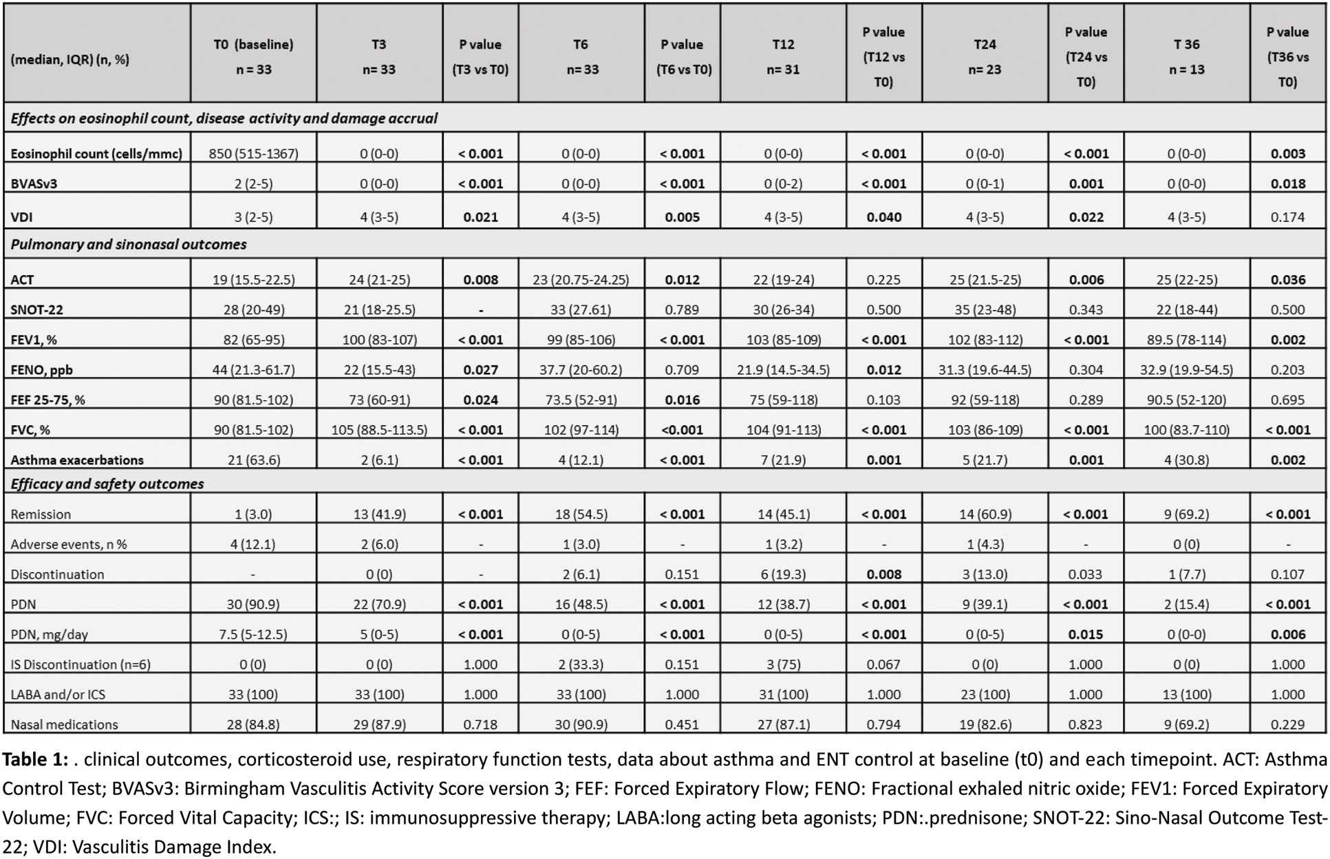 Results: The study included 33 patients with EGPA, 51.5% were male. At the time of diagnosis, a total of 11 (33.3%) patients were positive for ANCA, with anti-MPO specificity, and a median eosinophil count of 1980 cells per µL (1360-4440); At the start of benralizumab median age was 56 years [IQR 47-62], the median disease duration was 31 (16-94) months, the most common manifestations being severe asthma (87.9%) and ENT involvement (66.7%). Benralizumab was started on top of conventional immunosuppressants in 6 (7.8%) of the cases, the most commonly therapies prior to benralizumab were methotrexate (51.5%) and azathioprine (33.3%). Notably 24.2% had previously been treated with mepolizumab (either 300 mg or 100 mg). Benralizumab showed significant effectiveness, with clinical remission rates rising from 39.4% (95%CI 22.9–57.9) at 3 months to 69.2% (95%CI 38.6–90.9) at 36 months (p<0.001 for all time points). Corticosteroid use decreased from 90.9% to 15.4% (p<0.001), eosinophil count dropped from 850(515-1367) to 0(0-0) cells/µL (p<0.001), and BVAS scores declined from 2(2-5) to 0(0-0) (p<0.001). The proportion of patients experiencing asthma exacerbations reduced, alongside improved lung function. The retention rate was 81.8% at 1 year, 72.0% at 2 years, 58.0% at 3 years. The main reason for treatment discontinuation was secondary failure, primarily driven by persistent and uncontrolled ENT/CRSwNP symptoms with 36.4% of patients switch to alternative therapies, primarily mepolizumab (300 mg) or dupilumab. No serious adverse events or hospitalizations occurred. Mild adverse events were observed in 21.2% of patients.