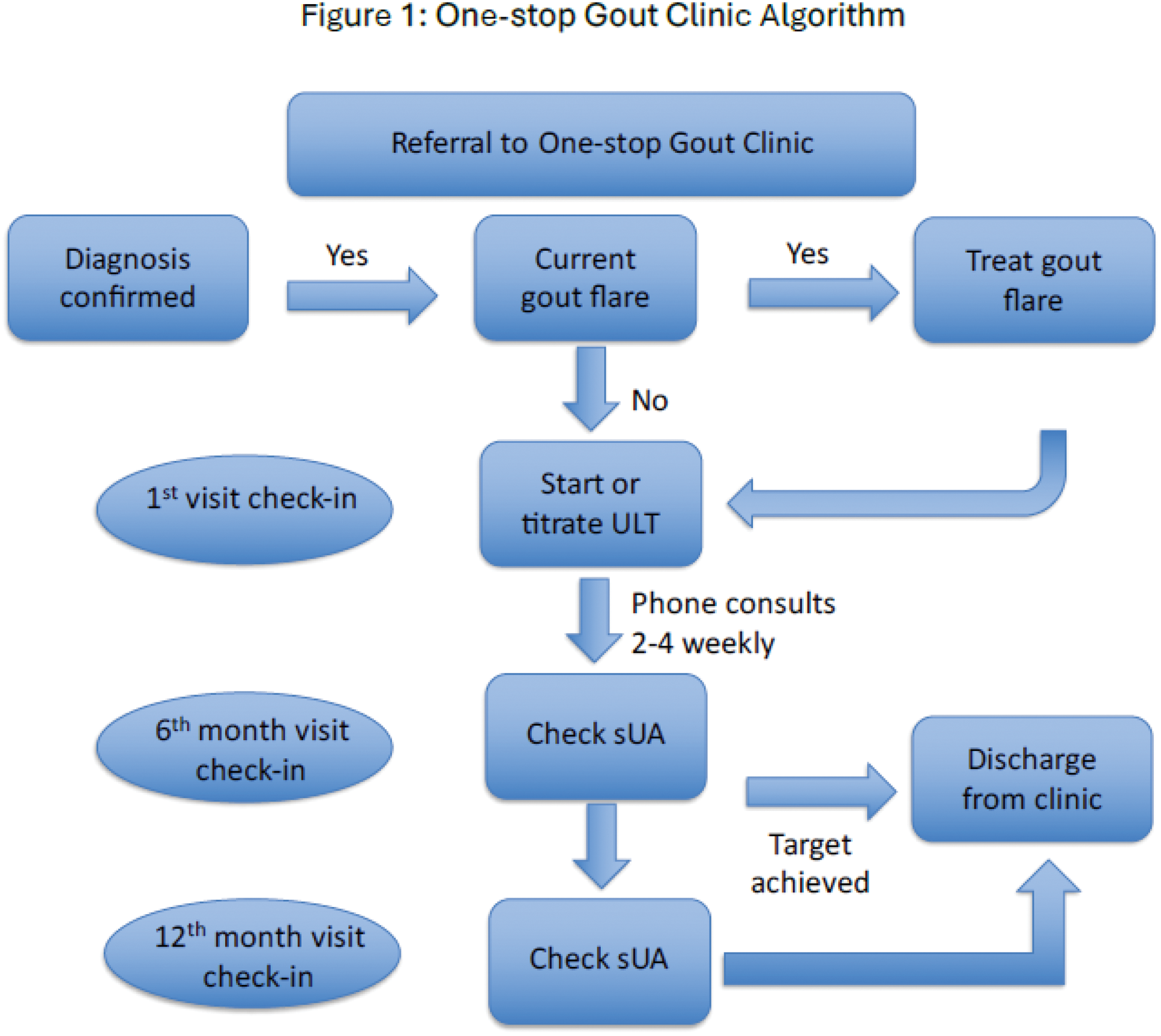 Methods: A retrospective review of the medical records of patients with established diagnosis of gout who were referred to the Rheumatology Clinic in a tertiary centre hospital within the period of 2 years from 2022 to 2023 were collected and analyzed using IBM SPSS Statistics Version 29.0.1. Patients who were seen at the One-stop Gout Clinic were reviewed by the Rheumatologist at the first clinic visit, followed by education and counselling by the assigned pharmacist, rheumatology specialist nurse and dietitian. Scheduled sUA level monitoring, teleconsultations and titration of ULT via a treat-to-target approach based on a drug titration protocol was done by the pharmacist and nurse in between clinic appointments, aiming to improve adherence and patient-centered outcomes. Patients were given subsequent clinic appointments at 6 months and 1 year. Following that, patients were discharged for follow-up and continuation of care at the primary care clinic (Figure 1).