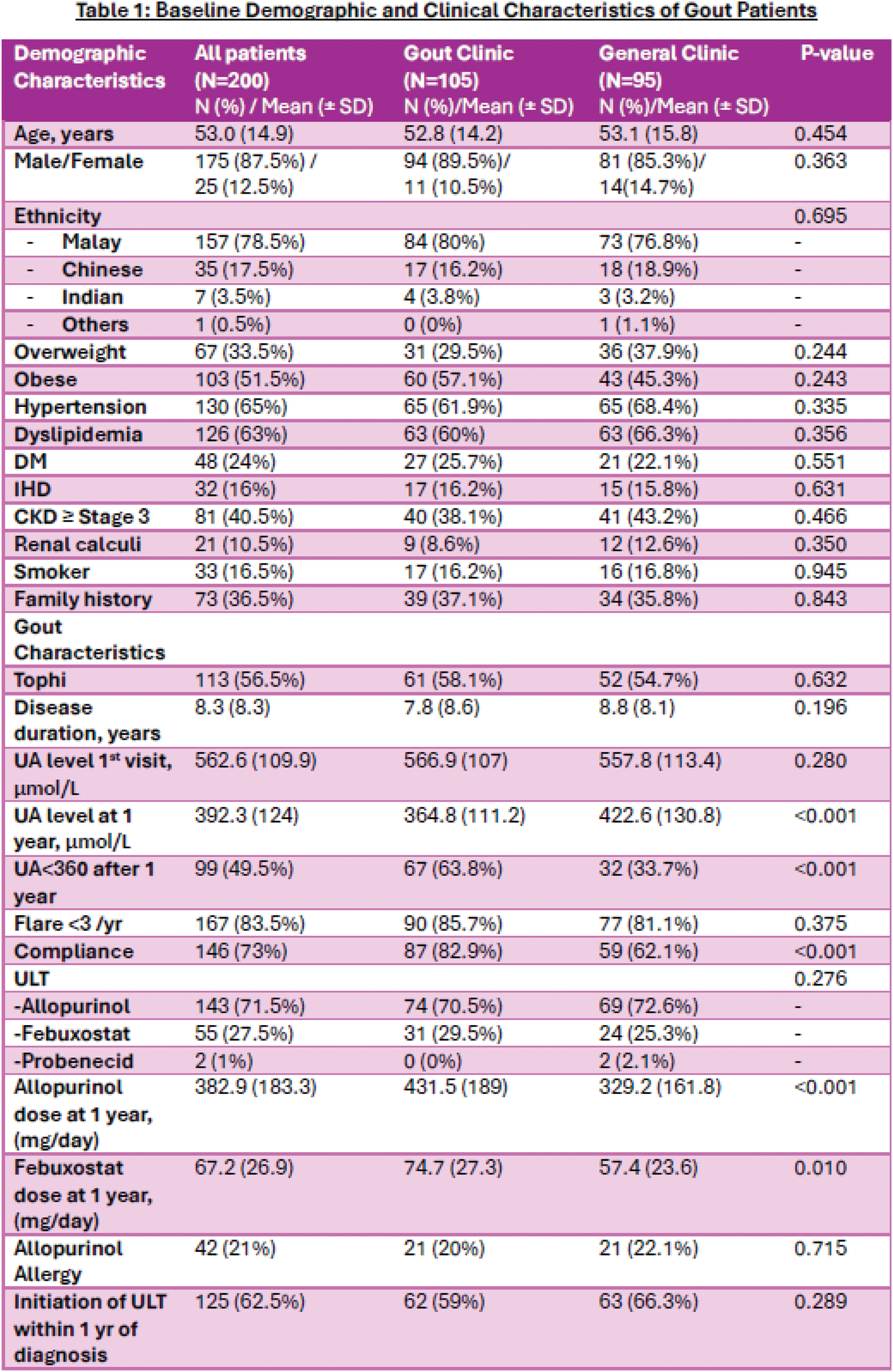 Results: There were 200 confirmed gout referrals received by the Rheumatology Department within the 2-year study duration, in which 105 patients were treated in the One-stop Gout clinic whereas 95 patients were treated in the General Clinic. Patients’ baseline demographic and clinical characteristics are listed in Table 1. Both groups had similar and comparable demographic and clinical characteristics. About half of the patients were obese (51.5%) and 40.5% of them had Chronic kidney disease Stage ≥3. Other comorbidities included Hypertension (65%), Dyslipidemia (63%), Diabetes mellitus (24%), Ischemic heart disease (16%), and renal calculi (10.5%). Slightly more than half of the patients (56.5%) had chronic tophaceous gout. The mean disease duration was 8.3 (± 8.3) years, and the mean sUA level at the first visit was 562.6 µmol/L (± 109.9). A substantial proportion of patients (62.5%) were initiated on ULT within the first year of diagnosis. There were 42 (21%) patients with history of allopurinol allergy. For the ULT used for gout treatment, majority of the patients (71.5%) were on Allopurinol, whereas 27.5% of patients were on Febuxostat and only 1% of the patients were on Probenecid. Notably, a significantly higher percentage of patients managed at the One-stop Gout Clinic achieved sUA of <360 µmol/L at 1 year as compared to patients seen at the General Clinic (63.8% vs 33.7%, p <0.001). The mean sUA level of patients in the One-stop Gout Clinic at 1 year follow-up was 364.8 µmol/L (± 111.2), which was significantly lower in comparison to the sUA of 422.6 µmol/L (± 130.8) in the General Clinic group (p<0.001). Allopurinol dose was significantly better optimized at 1 year in the One-stop Gout Clinic (431.5±189 mg vs 329.2±161.8 mg, p<0.001). Remarkably, patients from the One-stop Gout Clinic had better compliance (82.9% vs 62.1%, p<0.001) as compared to patients in the General Clinic. There was no statistically significant difference with regards to gout flare of less than 3 per year for both groups during the 1-year follow up period.