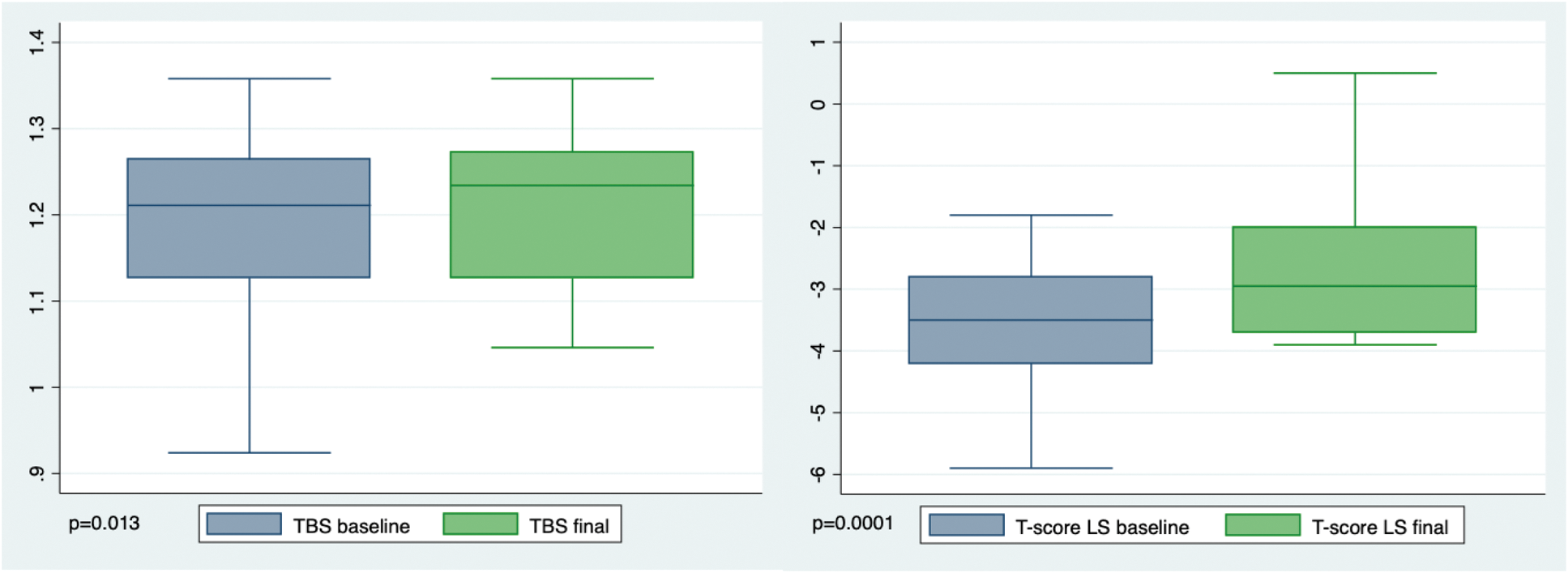 | Lumbar Spine T-score, mean ± SD (n=25) | -3.48 ± 1.17 | -2.66 ± 1.06 |