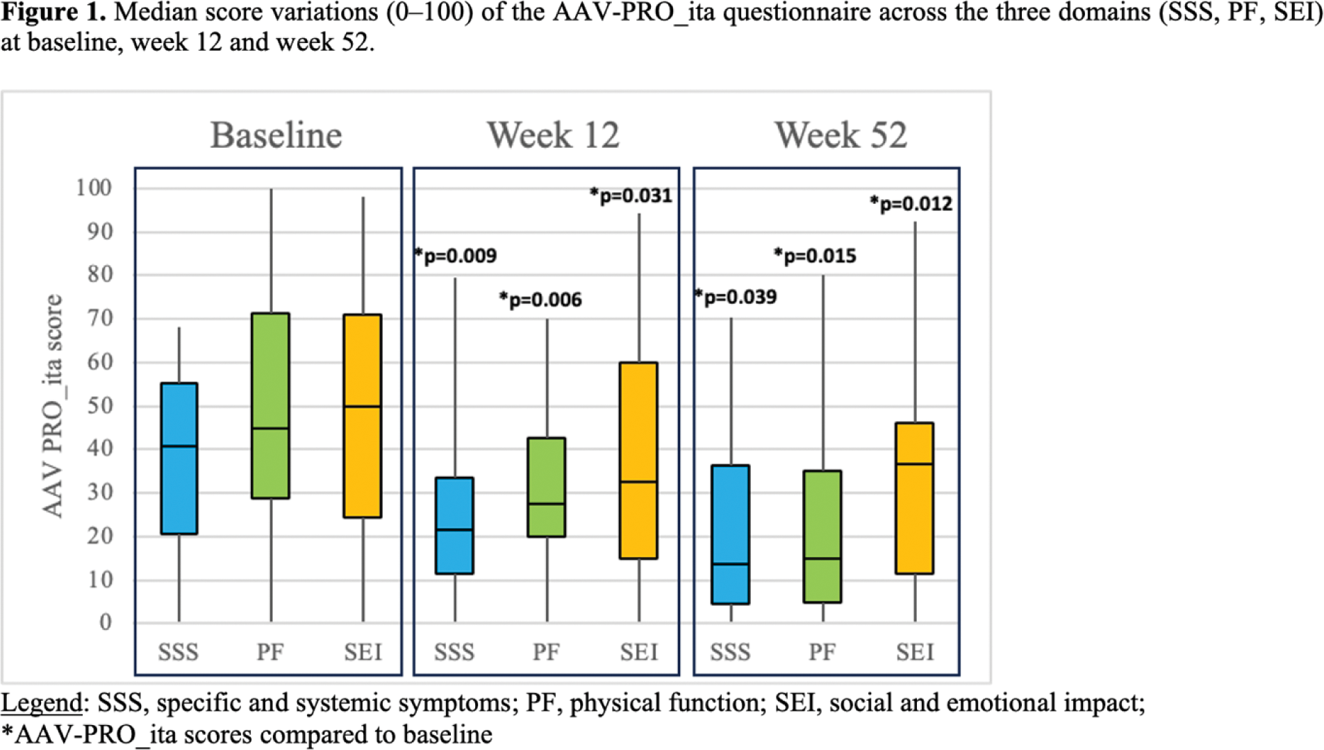 Methods: The prospective collection of clinical data began in May 2022 and included patients with either GPA or MPA, encompassing both newly diagnosed and relapsing cases who initiated avacopan therapy (baseline). The Italian AAV-PRO questionnaire was completed for each patient every three months [2].