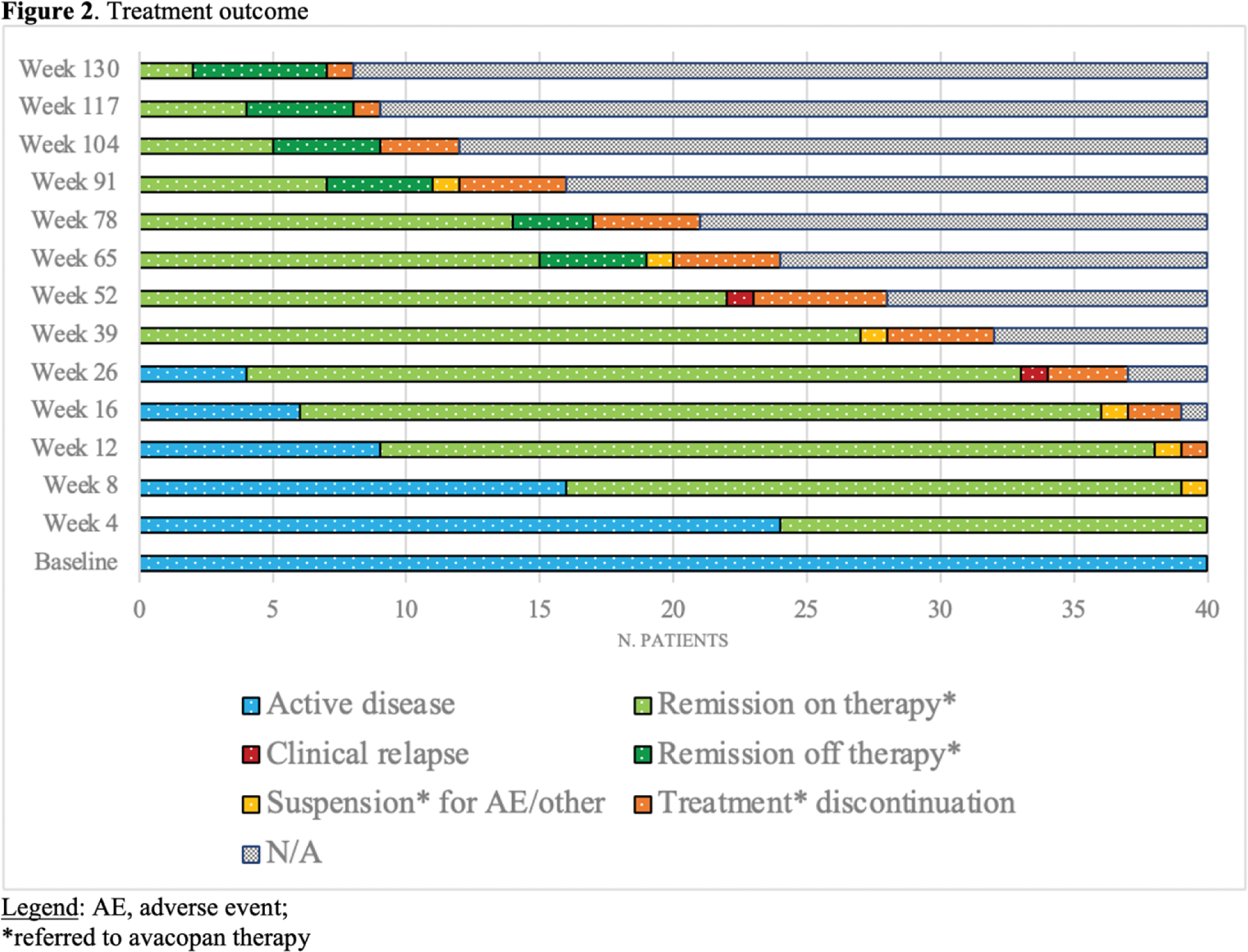 Conclusion: This study highlights the early and sustained efficacy, safety, and improvements in quality-of-life scores associated with avacopan treatment in the real-world management of AAV in a cohort of Italian patients. Avacopan enables early clinical remission, CS reduction, and improvements in renal function parameters. Treatment discontinuation occurred in 20% of patients due to relapses, infections, or comorbidities; however, the continuation of treatment beyond one year in nearly half of patients suggests that avacopan is well-tolerated for long-term disease control.