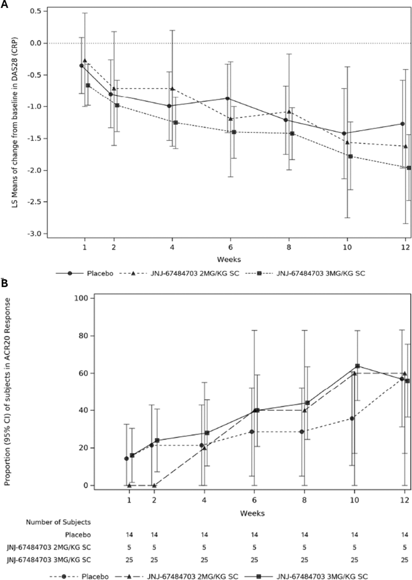 Results: Of 92 patients screened, 44 patients were randomized to JNJ-67484703 2 mg/kg (n=5), 3 mg/kg (n=25) or placebo (n=14). Demographics and baseline characteristics were comparable across the JNJ-67484073 and placebo groups, with a median age of 55.5 years, disease duration of 8.7 years, and baseline DAS-28-CRP of 6.3. All patients were receiving methotrexate, 72.7% were receiving oral glucocorticoids, and 40.9% were receiving NSAIDs. No participants had prior exposure to biologic or targeted-synthetic DMARDs. TEAEs were reported in 4 (80%) patients receiving JNJ-4703 2 mg/kg, 17 (68%) patients receiving JNJ-4703 3 mg/kg, and 10 (71%) patients receiving placebo. None of the reported TEAEs were severe in intensity, and no deaths were reported during the study. Three serious TEAEs were reported in 2 participants: SARS-COV-2 infection followed by pneumonia in 1 participant (2 mg/kg group) and community-acquired pneumonia in 1 participant (3 mg/kg group). Infections occurred in approximately 20% of patients in each treatment group, with urinary tract infections (UTIs) the most common (7.1% placebo, 10% combined JNJ-67484703 group). All patients who developed UTIs had a history of recurrent UTIs and no clinical signs of active infection at enrollment. At Week 12, the least squares (LS) mean difference (95% confidence interval (CI)) in Week 12 DAS28-CRP from baseline between the JNJ-67484703 3 mg/kg and placebo groups was -0.69 (-1.55, 0.18); nominal p=0.117 (Figure 1A). At the end of follow-up (Week 24), both JNJ-67484703 groups continued to show numerically greater reductions in DAS28-CRP versus placebo, but the magnitude of the difference decreased; the LS mean difference (95% CI) between JNJ-67484703 3 mg/kg and placebo was -0.47 (-1.59, 0.64) with nominal p=0.396. At Week 12, the proportions of patients achieving ACR20, ACR50, and ACR70 were generally comparable across treatment groups, but analysis by visit showed numerically greater ACR20 responses in the JNJ-67484703 3 mg/kg group versus placebo between Week 4 and Week 10 (Figure 1B). JNJ-67484703 induced a decrease in circulating PD-1 + CD4 + and CD8 + T cells that was dependent on the cell surface density of PD-1 expression. Steady state serum concentrations of JNJ-67484703 were approximately achieved by Week 4, and overall incidence of antibodies to JNJ-67484703 was low.