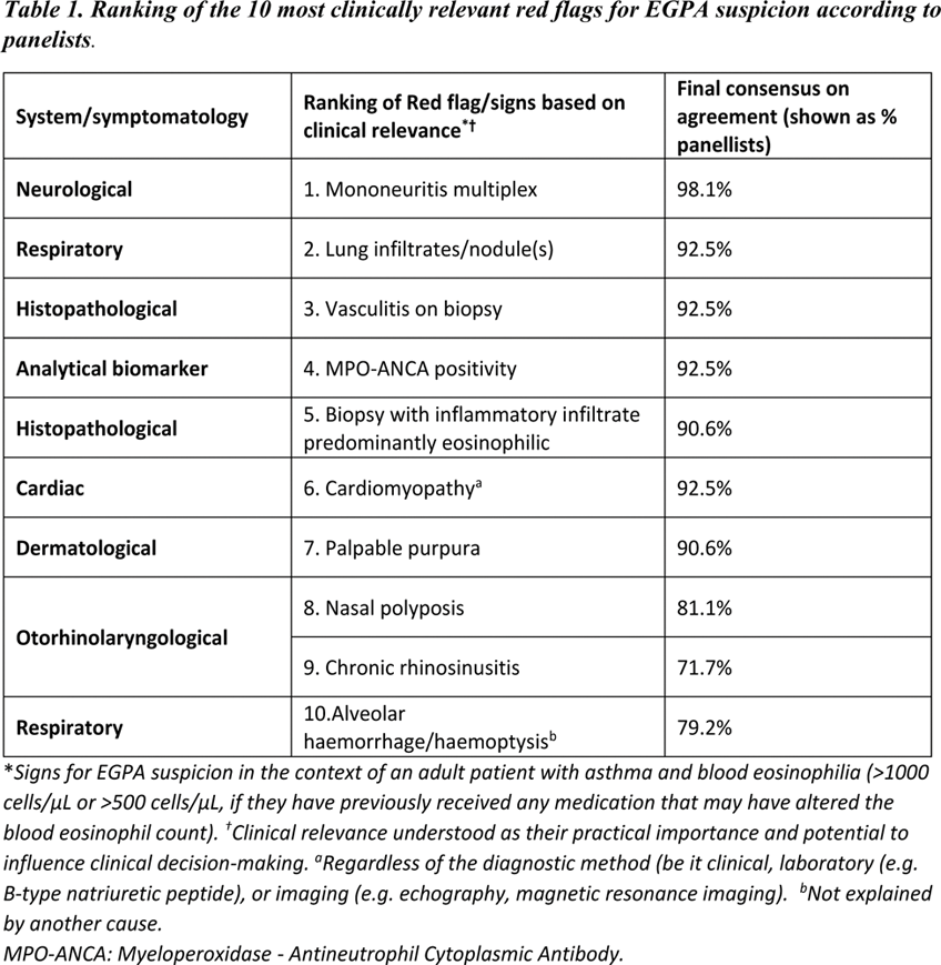 Conclusion: EGPAware is the first European study to provide a checklist of red flags, developed with input from a multidisciplinary panel of EGPA-treating physicians, to aid clinicians in identifying potential EGPA cases and, therefore, improve referral and treatment timelines. The EGPAware study reveals variability in how physicians prioritize red flags, emphasizing the need for unified training and a multidisciplinary approach to EGPA management.