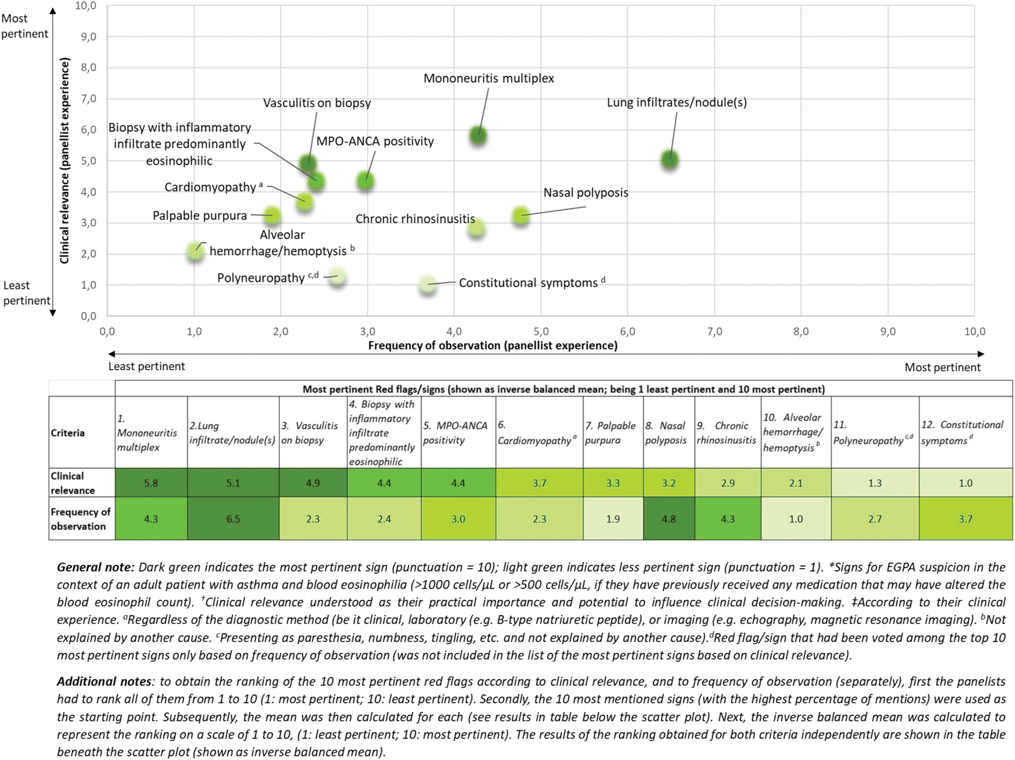 Scatter plot of the most pertinent Red Flags according both to clinical relevance *† and frequency of observation ‡ for EGPA suspicion.