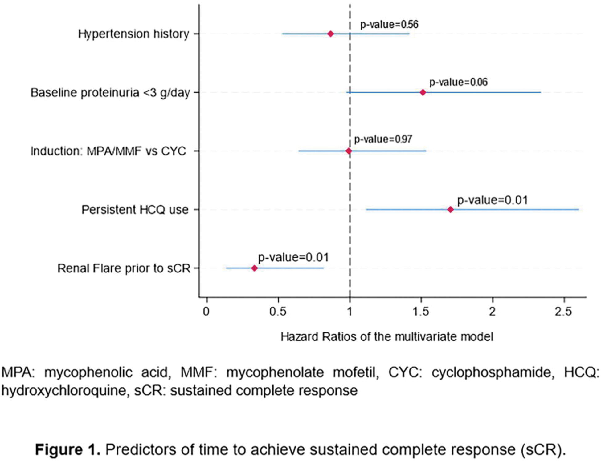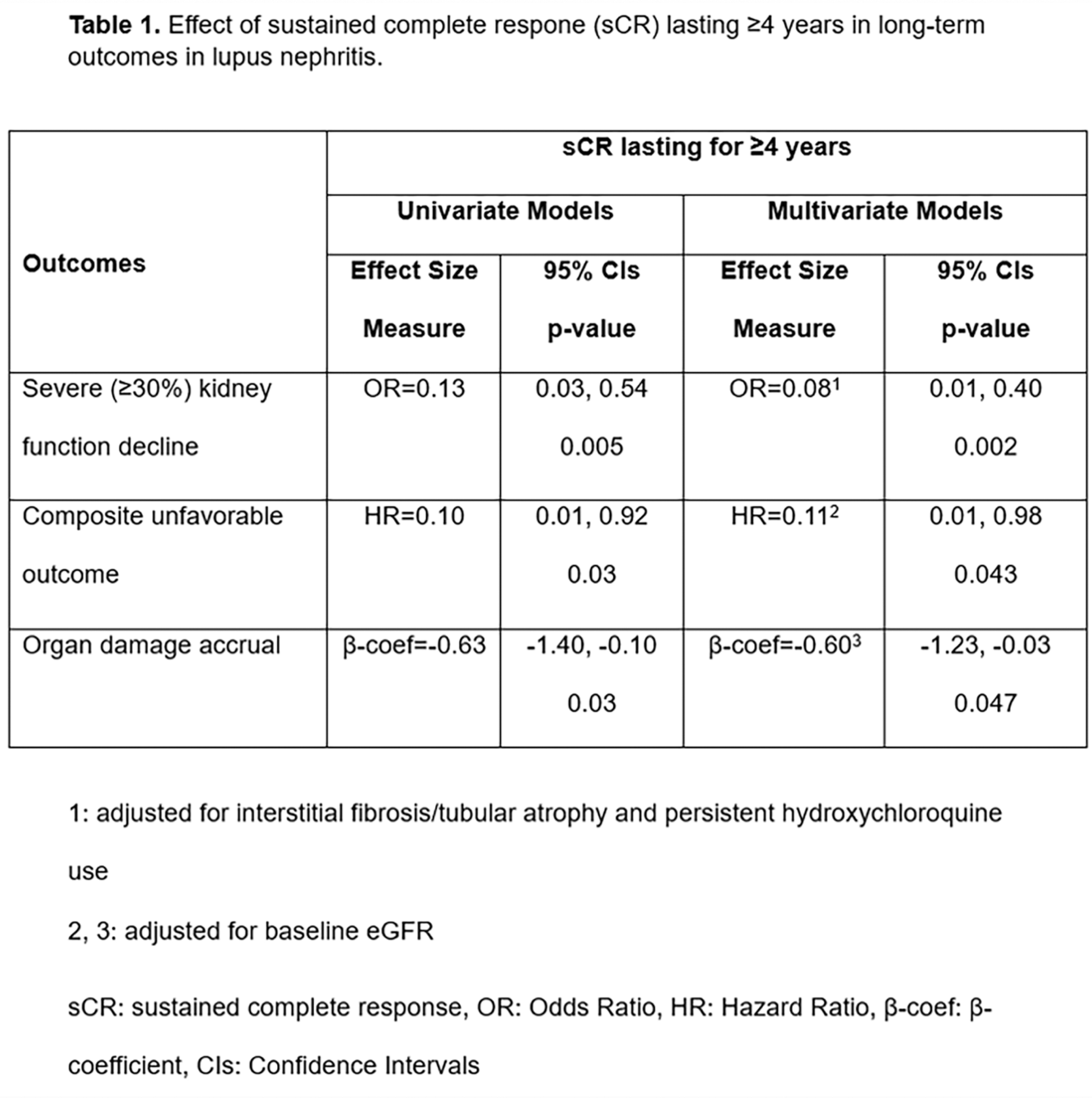 Conclusion: Achievement of sCR is feasible in a real-world setting and provides substantial benefits in terms of renal survival and damage accrual. Non-nephrotic levels of baseline proteinuria, persistent HCQ use and absence of flares are associated with shorter time to achieve sCR while four years emerged as the minimum CR duration required to protect against an unfavorable long-term prognosis.
