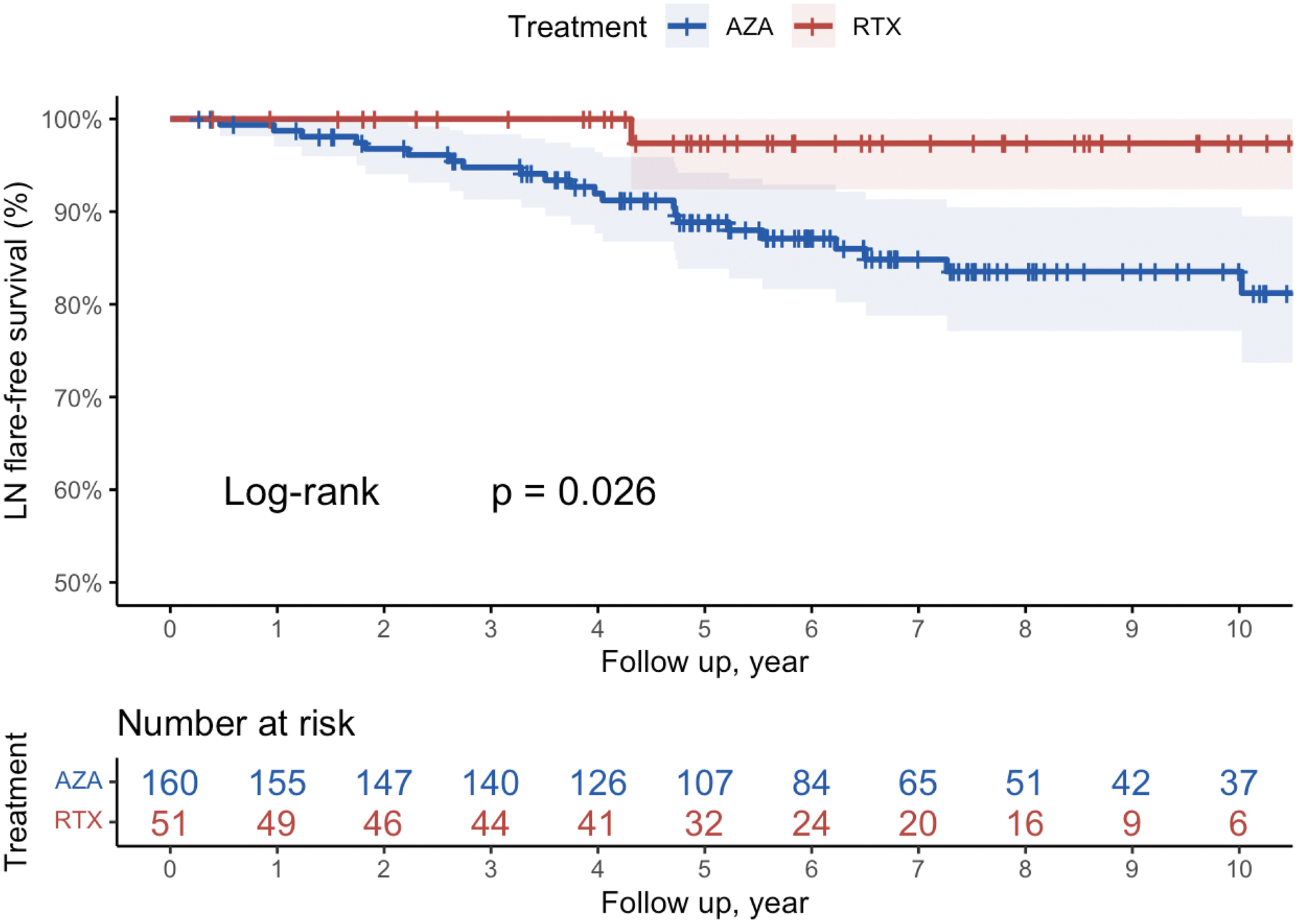 Results: From 2006 to 2023, 388 SLE patients receiving either rituximab and azathioprine for non-renal causes were identified, and 211 patients were enrolled into the final analysis. The median (IQR) age on enrollment was 37 (29-49) years and 89% were female. 97% patients took concomitant hydroxychloroquine, and all received oral glucocorticoids. The median cycle of rituximab course was 6.0 (3.0-9.5). Rituximab patients had higher baseline SLEDAI (10.0 vs. 7.5, p = 0.02) compared with those receiving azathioprine. 5 patients (9.8%) in rituximab group had transient proteinuria > 0.5 g/day before starting the therapy, compared with 9 (5.6%) in azathioprine group. At a median follow-up duration of 6.1 (4.3-8.8) years, one (2%) patient receiving rituximab patients developed lupus nephritis and 26 (16%) in azathioprine group (p = 0.026) (Figure 1). On multivariable and multivariable Cox regression analyses, the baseline SLEDAI score (HR: 1.13, 95% CI: 1.04-1.23, p = 0.004), history of transient proteinuria (HR: 5.87, 95% CI: 2.27-15.2, p < 0.001), were independent risk factors for subsequent LN flares. The use of rituximab (HR: 0.04, 95% CI: 0.00-0.36, p = 0.004) was associated with decreased risk for LN development (Table 1).