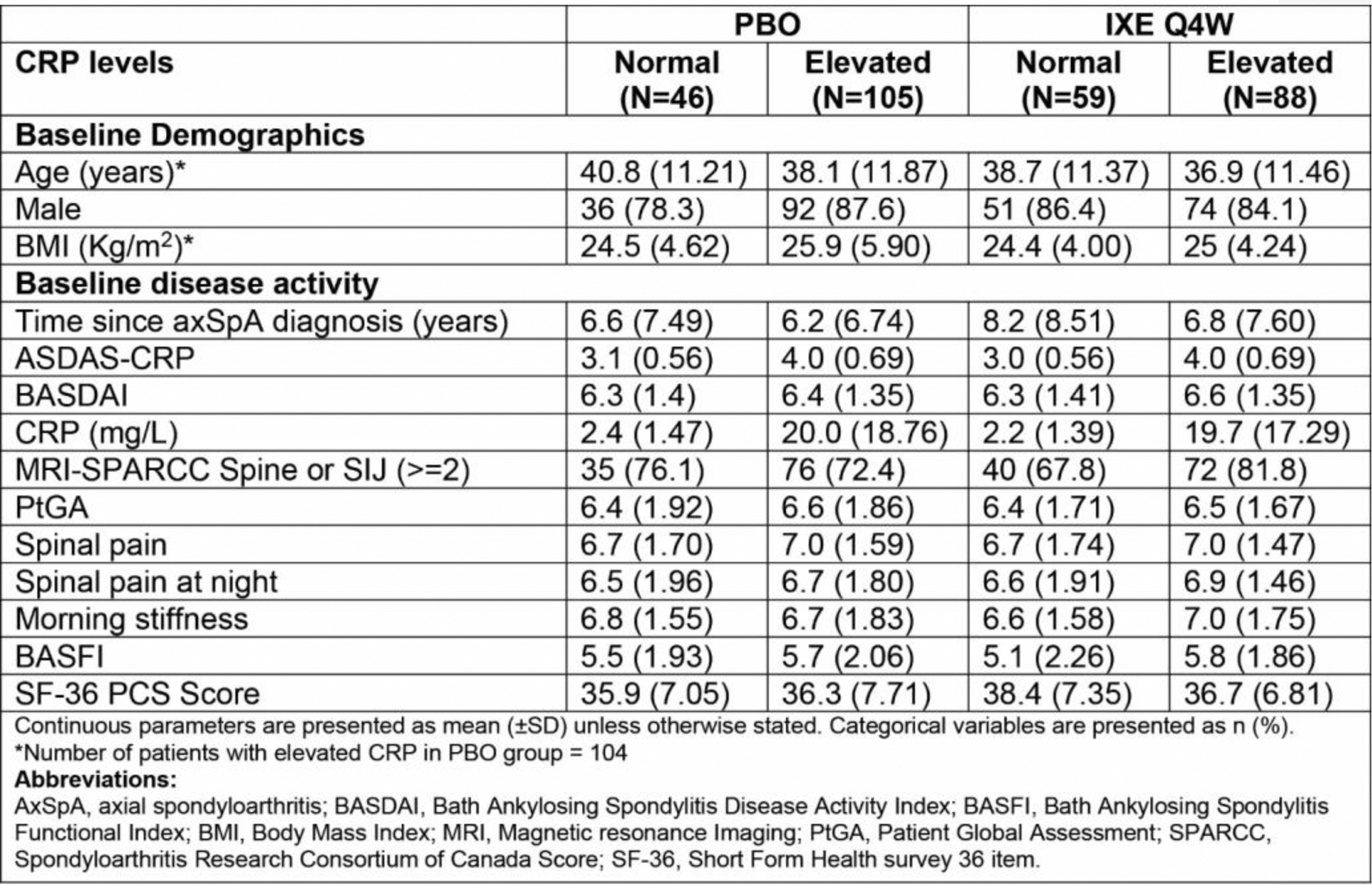 Conclusion: These data indicate that IXE provides substantial benefits in the treatment of patients with r-axSpA with both normal and elevated baseline CRP levels.