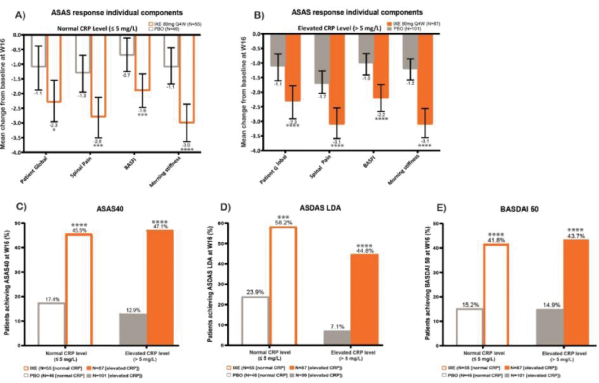 A ) Mean CFB of ASAS response individual components at week 16 for patients with normal CRP. B ) Mean CFB of ASAS response individual components at week 16 for patients with elevated CRP. C ) ASAS 40 response (%) at W16 of patients receiving IXE vs. PBO stratified by CRP level. D ) Percent of patients achieving ASDAS low disease activity at W16 receiving IXE vs. PBO stratified by CRP level. E ) Percent of patients achieving BASDAI 50 at W16 receiving IXE vs. PBO stratified by CRP. * = p ≤ 0.05 ** = p ≤ 0.01 *** = p ≤ 0.001 **** = p ≤ 0.0001.