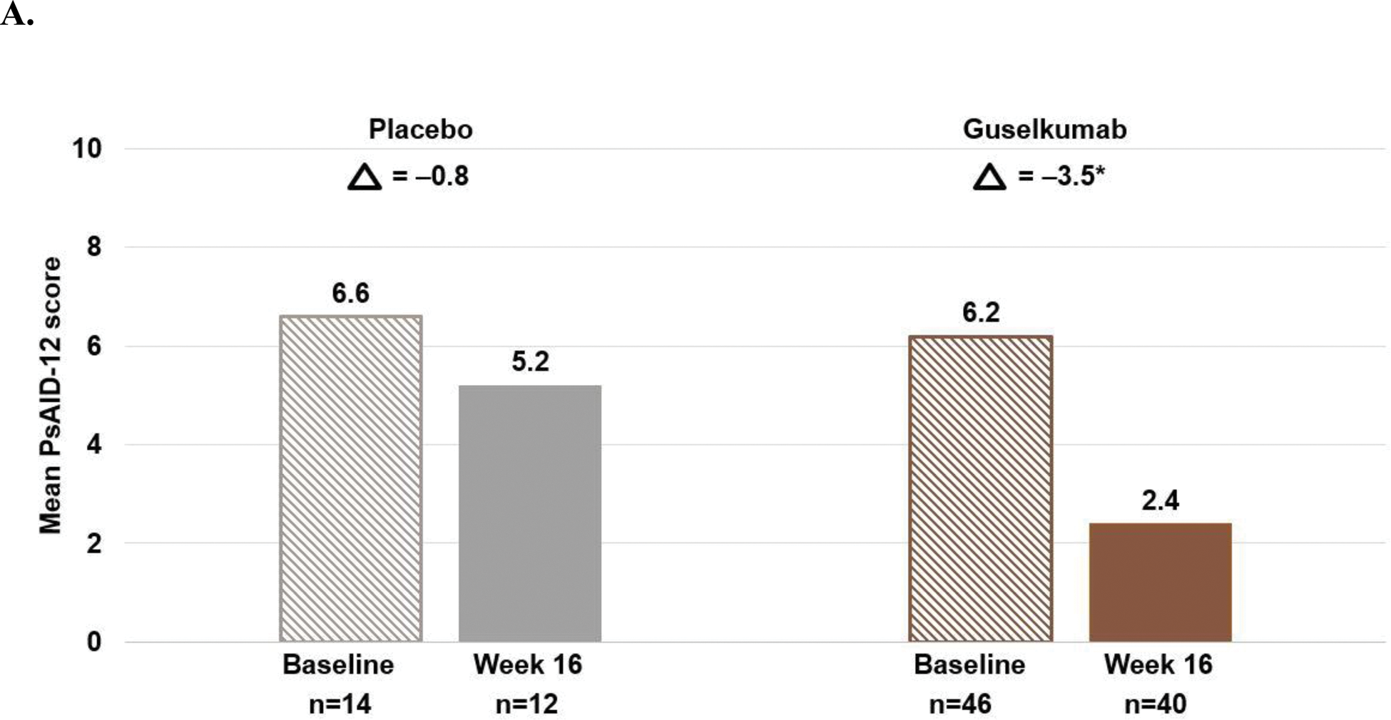Objectives: This post hoc analysis was conducted to assess efficacy and patient-reported outcomes at Week 16 for participants with psoriatic arthritis (PsA) at baseline.