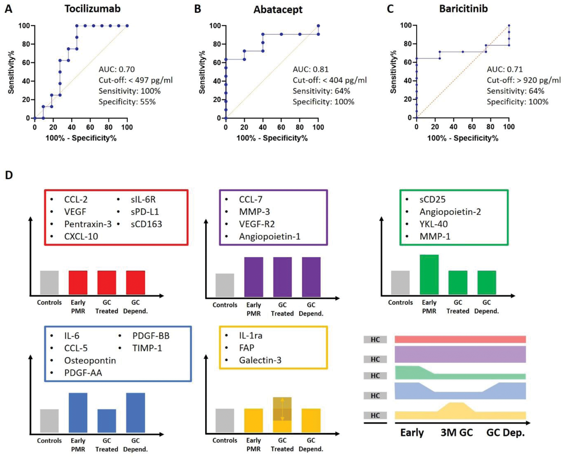 A-C Receiver operating characteristics curves for the response to tocilizumab (A), abatacept (B) or baricitinib (C) defined by achieving the primary outcome of the respective trial in early polymyalgia rheumatica. D Different patterns of biomarkers based on their level in controls (healthy elderly subjects), early untreated polymyalgia rheumatica (PMR) patients, PMR patients treated with glucocorticoids (GC) at 3 months and GC-dependent PMR patients.