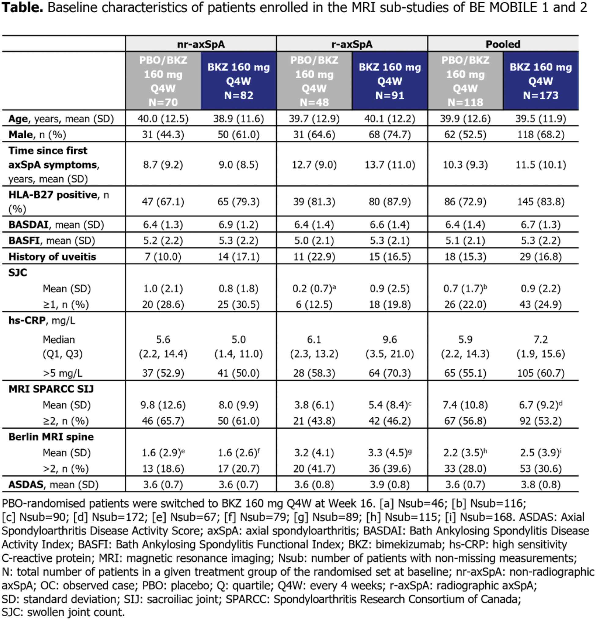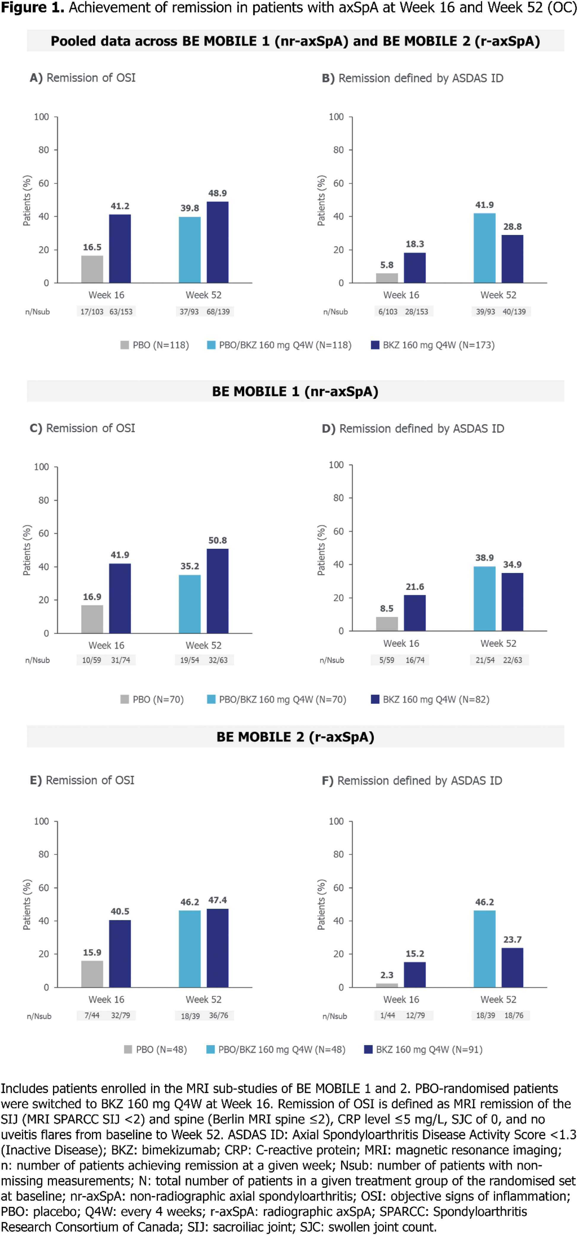 Methods: BE MOBILE 1 (NCT03928704) and BE MOBILE 2 (NCT03928743) comprised 16-week double-blind, placebo (PBO)-controlled periods followed by 36-week maintenance periods. Patients were randomised to subcutaneous BKZ 160 mg every 4 weeks (Q4W) or PBO, with all patients receiving BKZ from Week 16 onwards. Remission of OSI comprised MRI remission of the SIJ and spine (MRI Spondyloarthritis Research Consortium of Canada [SPARCC] SIJ score <2 and Berlin MRI spine score ≤2), CRP ≤5 mg/L, SJC of 0 and no uveitis flares from baseline to Week 52. The proportion of patients from the BE MOBILE 1 and 2 MRI sub-studies achieving these criteria was compared with those achieving ASDAS ID. No formal statistical analyses were conducted, and observed case (OC) data are reported.