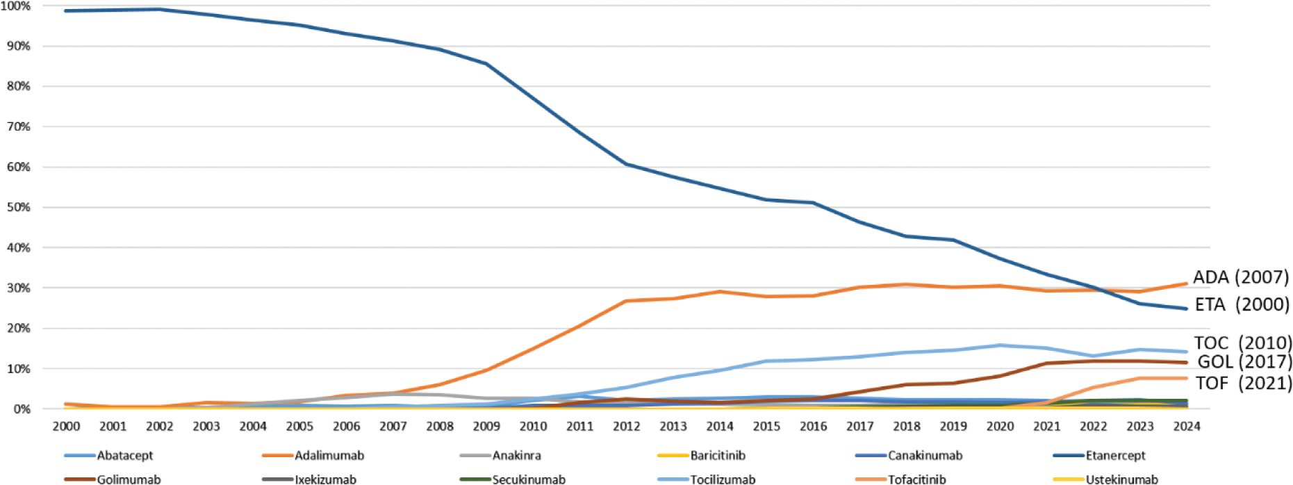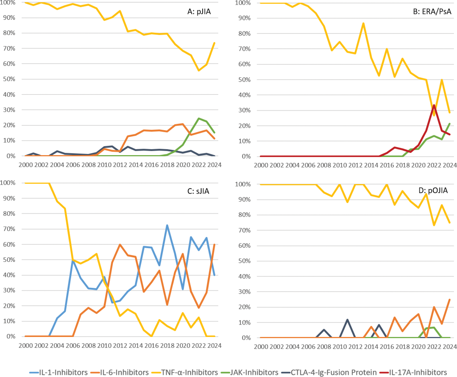 Results: Etanercept dominated the bDMARD usage for many years, accounting for over 90% of therapies until 2007. It was surpassed by Adalimumab in 2023, which accounted for 29% of usage compared to 26.1% for Etanercept (Figure 1). Since Adalimumab belongs to the TNF inhibitors (TNFi) as Etanercept, this shift reflects a change in the specific medications used rather than a departure from TNFi as the dominant treatment class. Over the past five years, TNFi still accounted for an average of 72.4% of the total bDMARD usage. Newer treatment options, such as IL-6 inhibitors (16.6%) and JAK inhibitors (6.1%), emerged in smaller proportions. For pJIA, TNFi remained the primary treatment. Abatacept, as a CTLA-4 fusion protein, accounted for a small proportion of initiations and JAK inhibitors peaked at 24% of initiations in 2022 (Figure 2A). TNFi transitioned from being the sole treatment option for sJIA to no new initiations. While until 2009, TNFi still accounted for 54% of new starts, usage steadily declined as IL-1 and IL-6 inhibitors became the preferred therapies, alternating in utilization over time (Figure 2C). In ERA/PsA, TNFi continued to dominate, while JAK inhibitors and IL-17 inhibitors collectively accounted for an average of 23.2% of new treatments (Figure 2B). For pOJIA TNFi maintained a dominant share of treatment initiation. Abatacept had a recurring impact on treatment patterns but is rarely used overall. Over recent years, IL-6 inhibitors have gained increasing significance, now accounting for approximately 25% of new treatments. (Figure 2D).