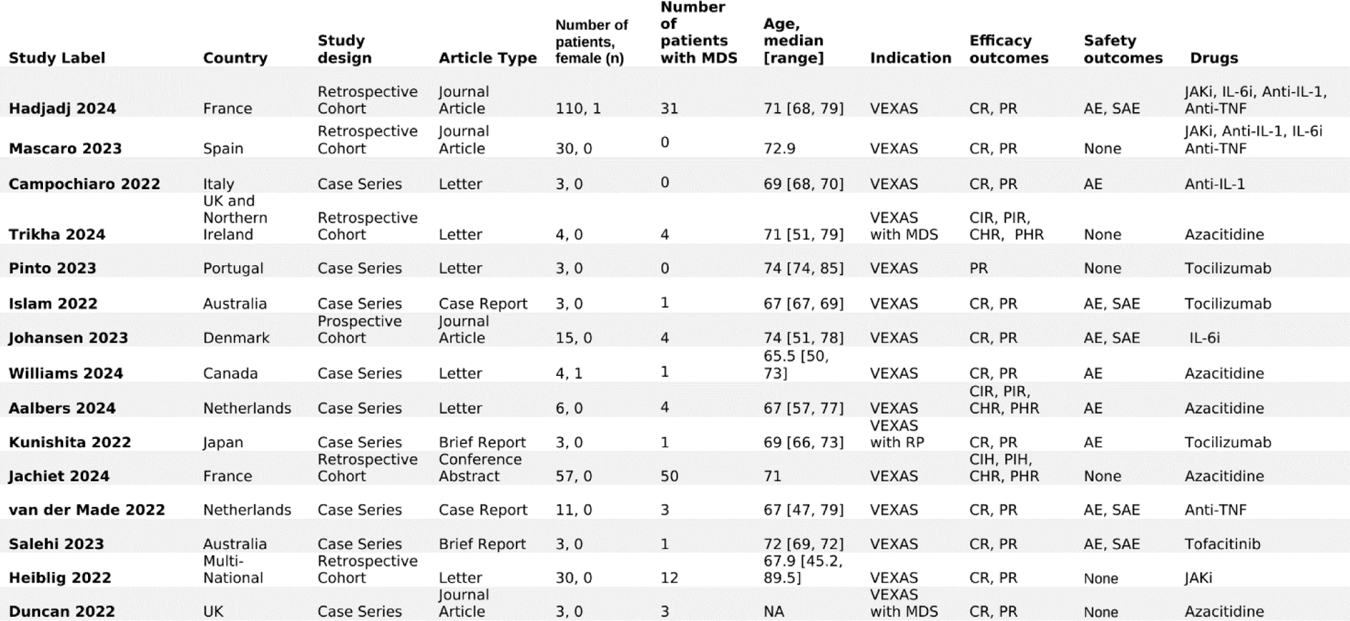Methods: The study protocol was registered in PROSPERO (CRD42024590134). MEDLINE and EMBASE were screened from inception until September 2024. We included patients with VEXAS syndrome who received treatment with azacitidine, JAK inhibitors, IL-6 inhibitors, anti-IL-1, or anti-TNF agents. The primary outcomes were the proportion of complete responders and patients who experienced adverse events. Secondary outcomes were the proportion of partial responders and the occurrence of serious adverse events. Given the lack of standardized response criteria for VEXAS syndrome, we defined complete response as clinically asymptomatic, normalization of inflammatory/hematological parameters, prednisolone <10mg/day or independence, or genetic remission (VAF <1%). Partial response was marked by symptom improvement, laboratory parameter normalization, and reduced prednisolone or VAF.