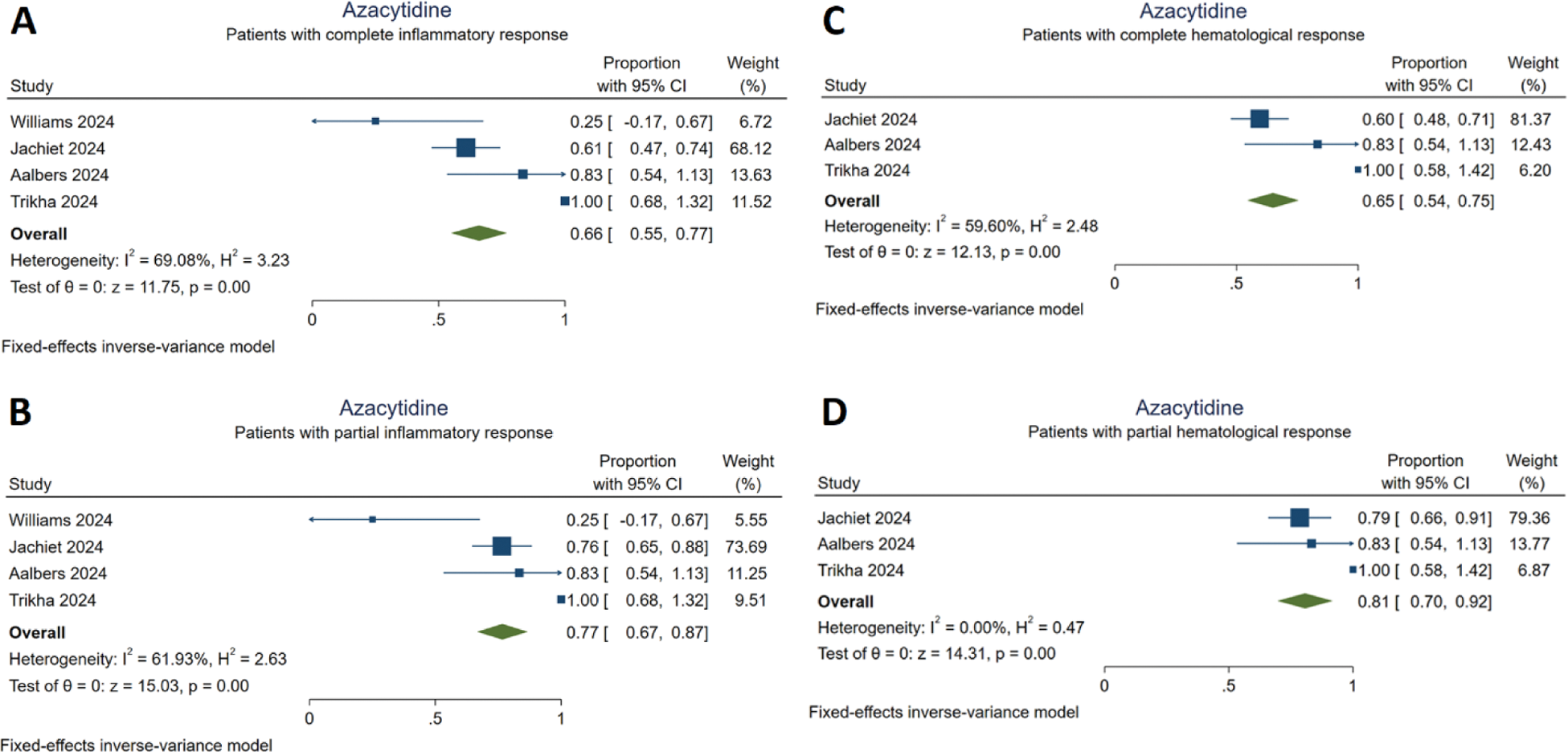 Results: A total of 15 studies and 291 patients with VEXAS syndrome were included. Detailed information about the study characteristics is presented in Table 1. Among the included patients, 116 (39.9%) were reported to have MDS. Azacitidine treatment resulted in complete and partial inflammatory response in 66% [95% CI (0.55,0.77)] and in 77% [95% CI (0.67,0.87)] of cases, respectively. Complete and partial hematological responses were achieved in 65% [95% CI (0.54,0.75)] and 81% [95% CI (0.70,0.92)] of the patients treated with azacitidine, respectively (Figure 1). Infections were frequently reported during azacitidine treatment. JAK inhibitors provided complete responses in 49% [95% CI (0.39,0.58)] and partial responses in 78% [95% CI (0.70,0.86)]. Cardiovascular adverse events were the most commonly reported serious adverse events during treatment with JAK inhibitors. IL-6 inhibitors led to a complete response in 27% [95% CI (0.18,0.36)] and partial response in 62% [95% CI (0.52,0.71)]. Anti-IL-1 treatment did not yield any significant increase in the proportion of complete responders [10%, 95% CI (0,0.21)]; however, a partial response to anti-IL-1 treatment was achieved by 35% [95% CI (0.22,0.48)] of the patients. Anti-TNF agents did not significantly increase the number of complete responders [9%, 95% CI (-0.04,0.22)] and the proportion of patients who partially responded to anti-TNF treatment was 27% [95% CI (0.09,0.45)].