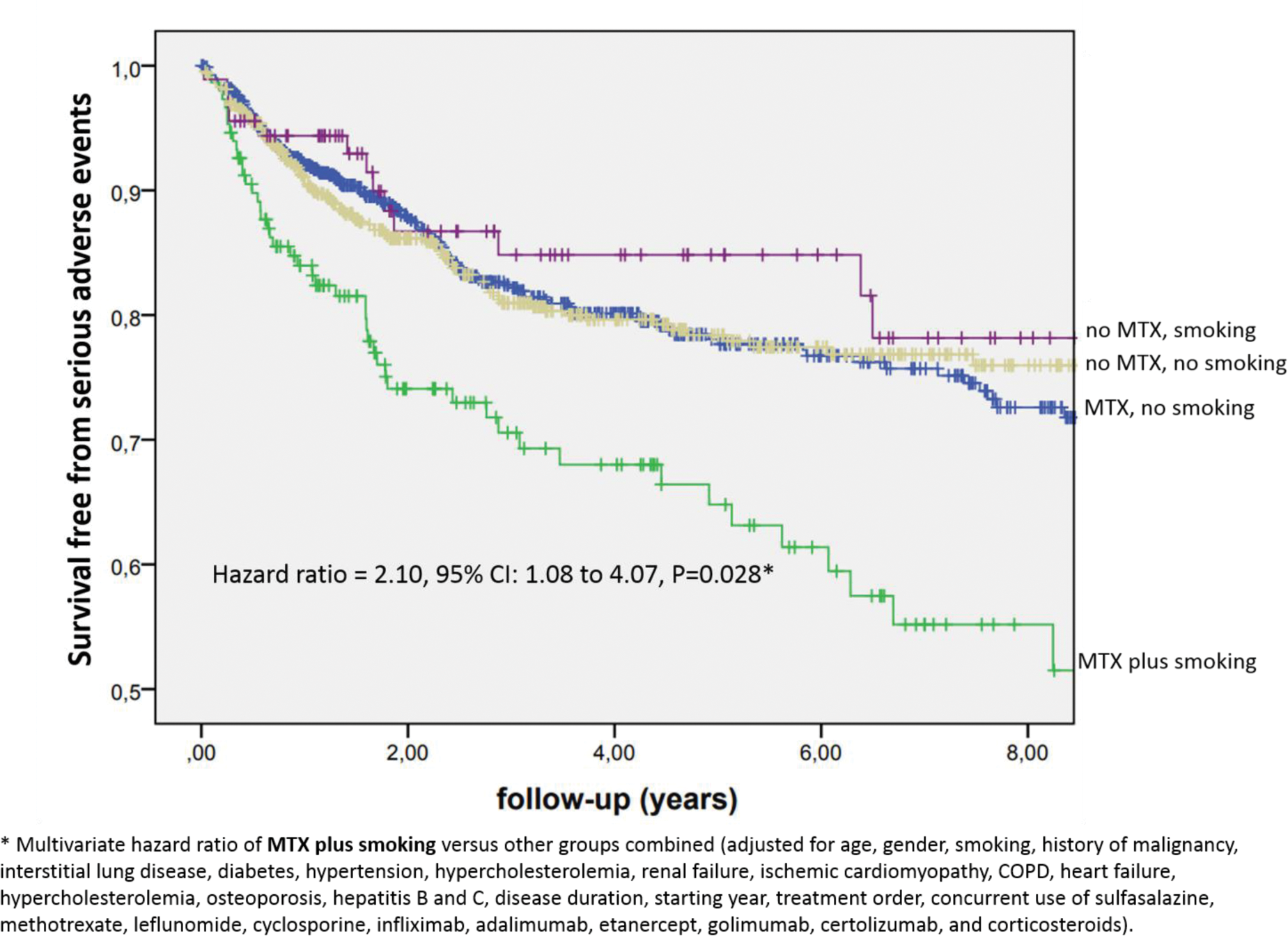 Conclusion: In this study, the use of methotrexate combined with smoking was associated with higher risk of serious adverse events in patients with RA and SpA treated with anti-TNF agents. We did not observe an independent increase in the risk of serious adverse events with smoking in patients not taking MTX. These results require confirmation through further studies, but it is possible that the deleterious effects of smoking in these patients are mediated, at least in part, by its interaction with methotrexate