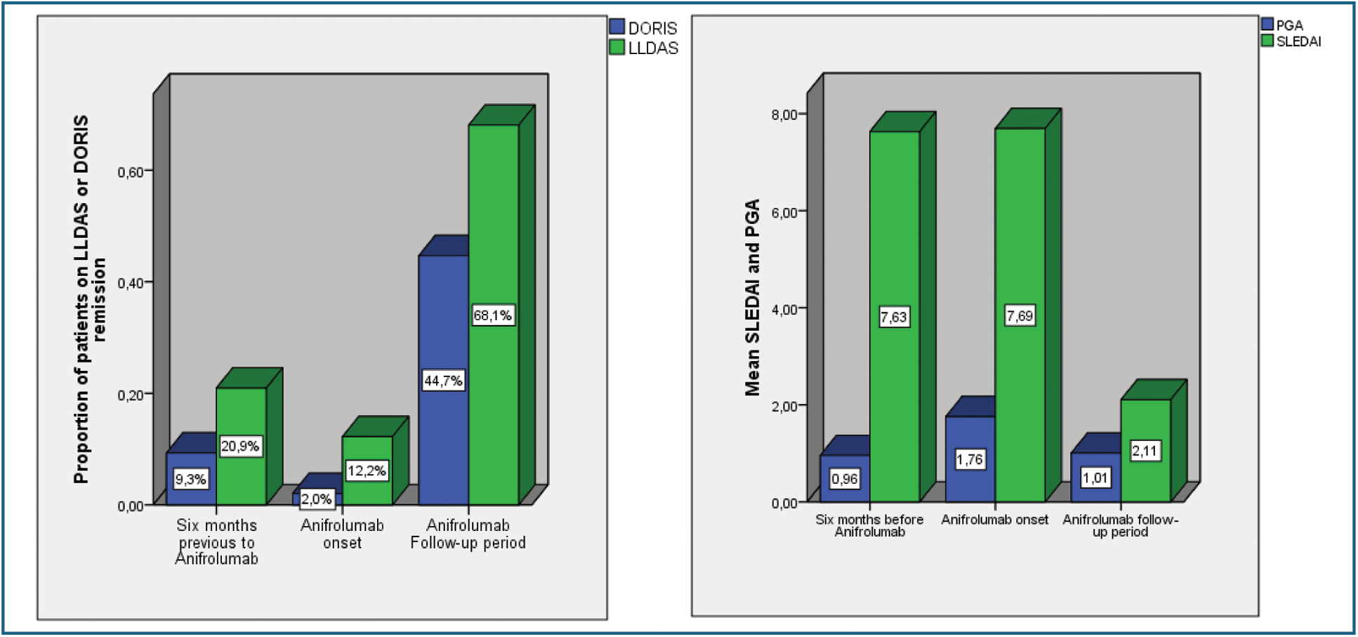 Conclusion: Six-month follow-up data of anifrolumab treatment in systemic lupus erythematosus in a real-world setting show a good response to maintain remission and a low disease activity state. The drug also demonstrated decreased disease activity, measured by SLEDAI and PGA. Anifrolumab showed a good response in the clinical trial settings. Here, we also provide a positive clinical evolution with real-world data. Data including further follow-up would be needed to describe the use of anifrolumab in LES in Spain.