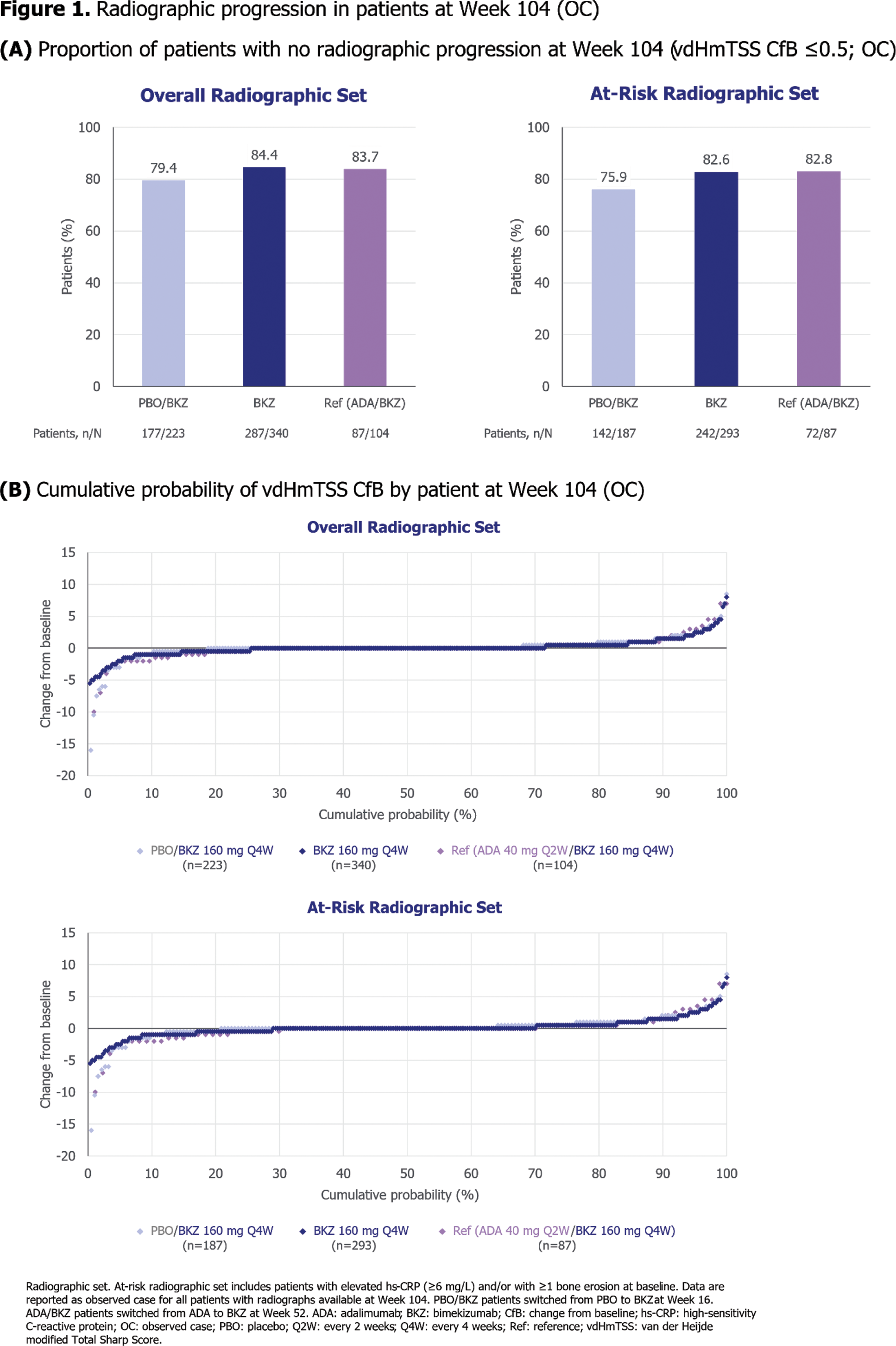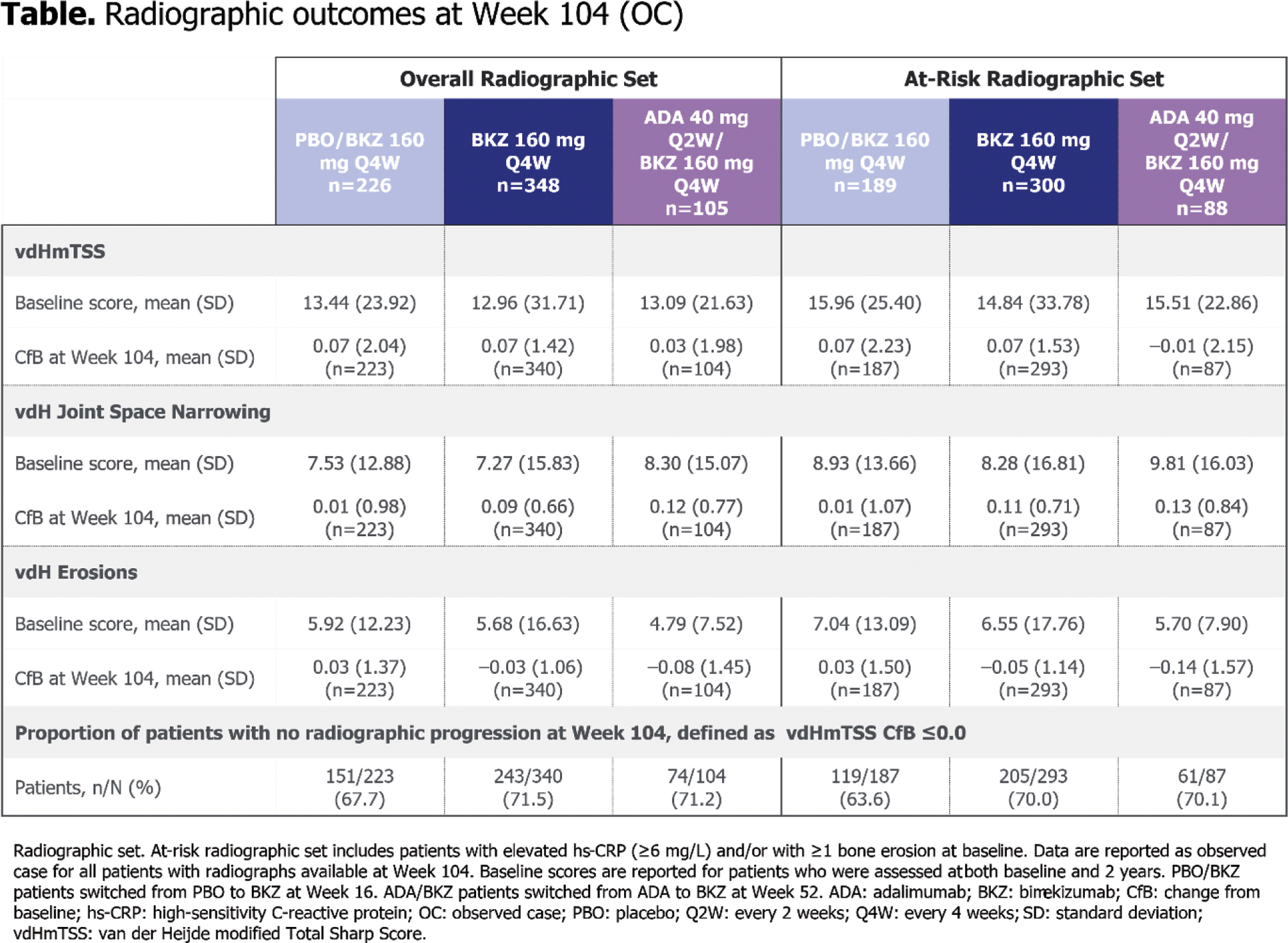 Methods: BE OPTIMAL (NCT03895203) assessed subcutaneous BKZ 160 mg every 4 weeks (Q4W) in patients with PsA; the study was placebo (PBO)-controlled to Week 16, at which time PBO patients switched to BKZ (PBO/BKZ). BE OPTIMAL included a reference arm (subcutaneous adalimumab [ADA] 40 mg every 2 weeks); these patients switched to BKZ at Week 52 (ADA/BKZ) with no washout between treatments. At Week 52, patients could enrol in BE VITAL (NCT04009499), an ongoing OLE, in which all patients received BKZ 160 mg Q4W. Radiographic progression was assessed on plain radiographs of the hands and feet using the van der Heijde modified Total Sharp Score (vdHmTSS; score range: 0–528, with higher scores representing greater damage), quantifying the extent of joint damage based on erosions and joint space narrowing (JSN). Radiographs were read centrally and independently by two experienced readers, blind to treatment assignment and time course of the films; readings were adjudicated by a third reader in the event of disagreement. Readings for the 2-year campaign were taken at baseline and Week 104. At Week 104, PBO/BKZ, BKZ-randomised and ADA/BKZ patients had received 88, 104 and 52 weeks of BKZ treatment, respectively. Data reported for patients in the overall radiographic set and a subgroup of patients at higher risk of progression (at-risk set; high-sensitivity C-reactive protein levels [hs-CRP] ≥6 mg/L and/or ≥1 bone erosion at baseline): mean change from baseline (CfB) in vdHmTSS, cumulative probability of vdHmTSS CfB and the proportion of patients with no radiographic progression (vdHmTSS CfB ≤0.5 and ≤0.0) at 2 years of total therapy. Additional outcomes include mean CfB in the vdH Erosions and JSN sub-scores. Data are reported as observed case for all patients with radiographs available at Week 104.