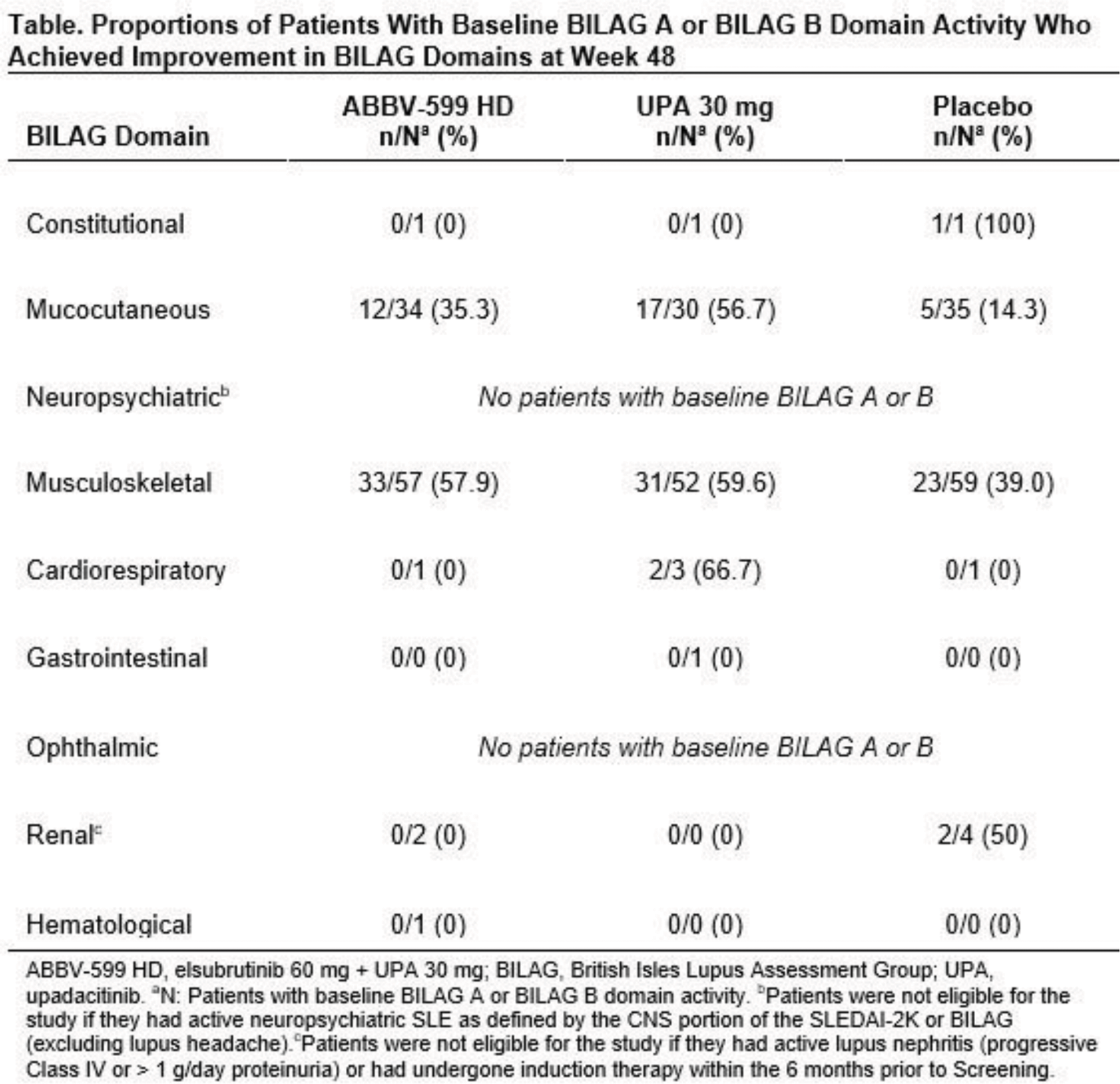Objectives: The objective of this post hoc analysis of the SLEek trial was to evaluate changes from baseline at week 48 in BILAG domains in patients with SLE receiving ABBV-599 HD, UPA 30 mg, or placebo.
