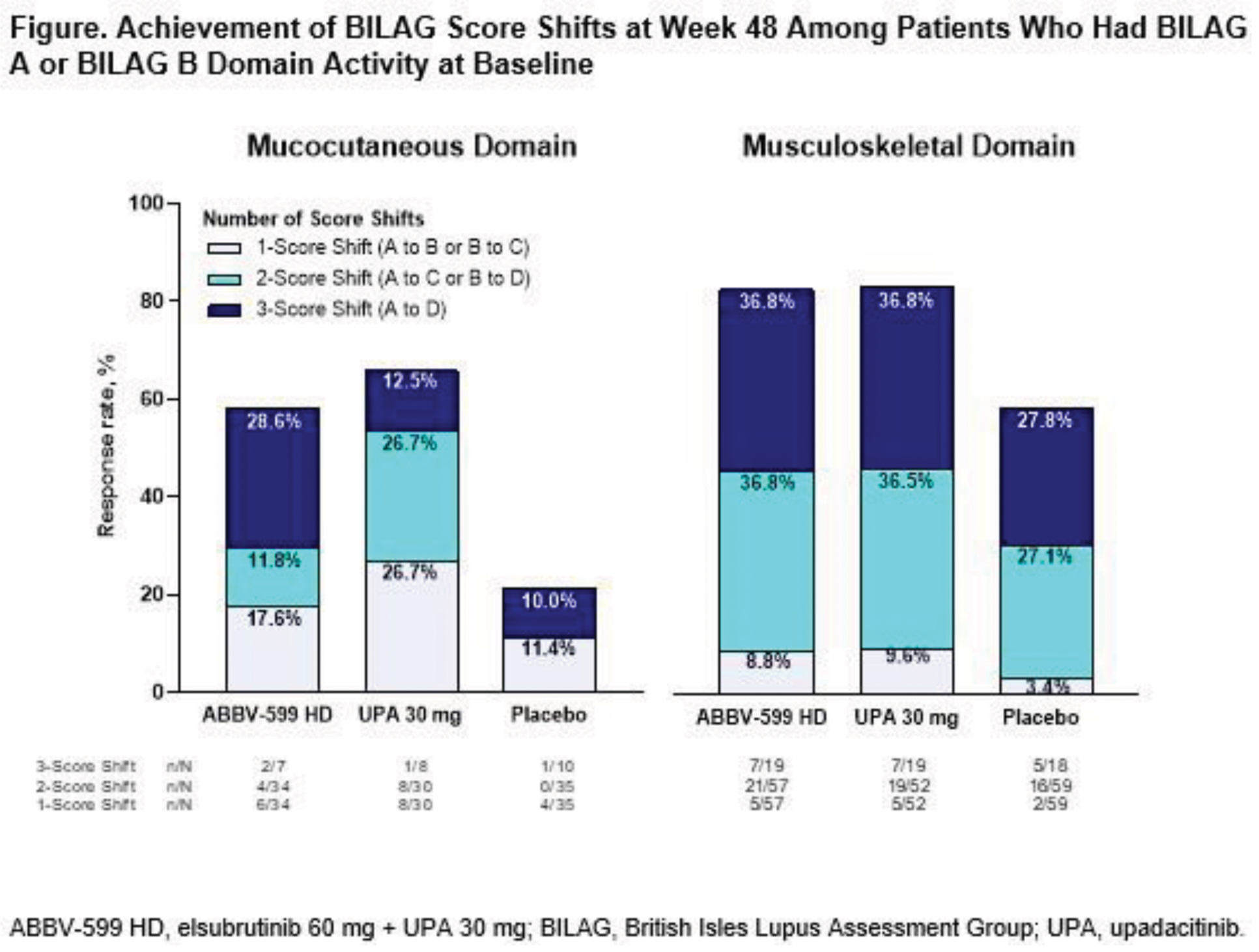 Methods: In this multicenter, double-blind trial (NCT03978520), patients with moderately to severely active SLE were randomized 1:1:1:1:1 to receive once daily ABBV-599 HD, ABBV-599 low dose (LD; ELS 60 mg + UPA 15 mg), ELS 60 mg, UPA 30 mg, or placebo. After a planned interim analysis, the ABBV-599 LD and ELS 60 mg groups were discontinued for lack of efficacy. This post hoc analysis evaluated BILAG domains and improving score shifts from baseline to week 48 in the continued treatment groups. For this analysis, definitions of 1-score shifts were BILAG A to B or B to C, 2-score shifts were BILAG A to C or B to D, and 3-score shifts were BILAG A to D.