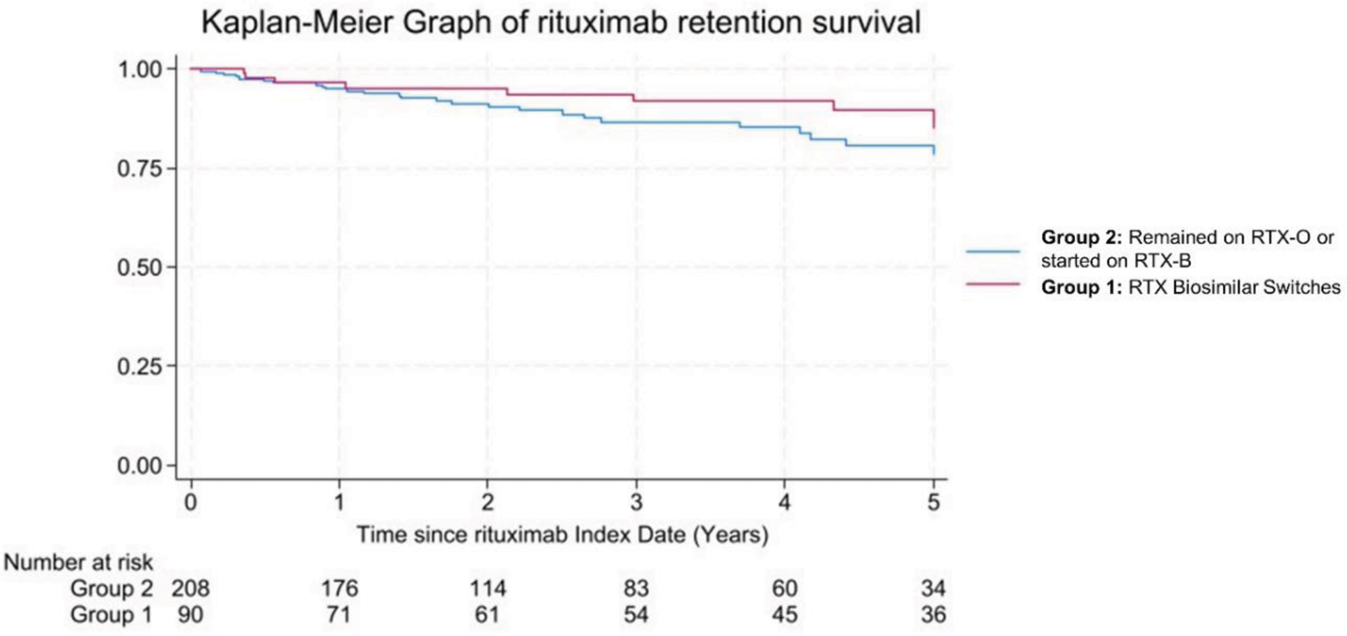 Results: At Index date, of 827 RMD patients treated with RTX, 300 (36%) were given for CTD-VAS, while the remaining for RA. Of these, 90/300 (30%) underwent non-medical switch, Group 1 [RTX-O to RTX-B = 61 (68%); between biosimilars = 29 (32%)]. They had mean (SD) age 51 (15) years, 61 (72%) were female, 64 (71%) had European ancestry, median (IQR) SLE duration of 8.7 (5-15) years, median (range) number of comorbidities of 1 (0-5), and diagnoses were SLE (53%), AAV (31%), Sjogren (4%), Myopathies (3%), Scleroderma (1%) and other CTD (8%). 16/300 (5%) patients remained on RTX-O, while 194/300 (65%) initiated treatment with RTX-B; therefore Group 2 = 210/300 (70%). At the last follow-up, of 90 patients in Group 1, 78/90 (87%) remained on RTX-B including 9/78 who underwent further biosimilar switches due to contractual agreement without problems and 1/78 (3%) reverted to the previous RTX-B brand due to development of a rash following biosimilar switch. 5/90 (6%) of patients on RTX-B reverted to RTX-O and regained response. Reasons were infusion reaction=1, serum sickness=1; neutropenic sepsis 5 days post-RTX switch=1; skin lesion=1; incomplete depletion and inferior response=1. Of 87/90 and 77/90 patients in Group 1 with paired clinical response and B-cells data in the RTX cycle before and after switch respectively, there was no difference in response rate (partial or full) and CD20+ cell complete depletion, p=0.289 and p=1.00 respectively (McNemara’s test). The delta difference in CD20+ cells depletion at 2 weeks from RTX infusion between before and after switch were no different, p=0.995 (Wilcoxon Sign Ranked Test). At Index Date, patients in Group 2 had shorter disease duration, less number of RTX cycles, and higher daily oral prednisolone dose than those in Group 1. At 5 years, 9/90 (10%) patients discontinued RTX in Group 1 [inefficacy=7 including 2 who reverted to RTX-O); 2 deaths due to pneumonia=1 and COVID pneumonitis=1], while in Group 2, 28/210 (13%) discontinued therapy [inefficacy=16; side effects=3; and deaths due to cardiac=4, pneumonia=2; pulmonary fibrosis=2; and multi-organ failure=1]. Kaplan-Meier analysis showed no difference in 5-year RTX retention survival between Group 1 and Group 2; HR 0.71 (95% CI 0.30-1.71), p=0.448, adjusted for disease duration, number of RTX cycles and oral prednisolone dose (Figure 1).