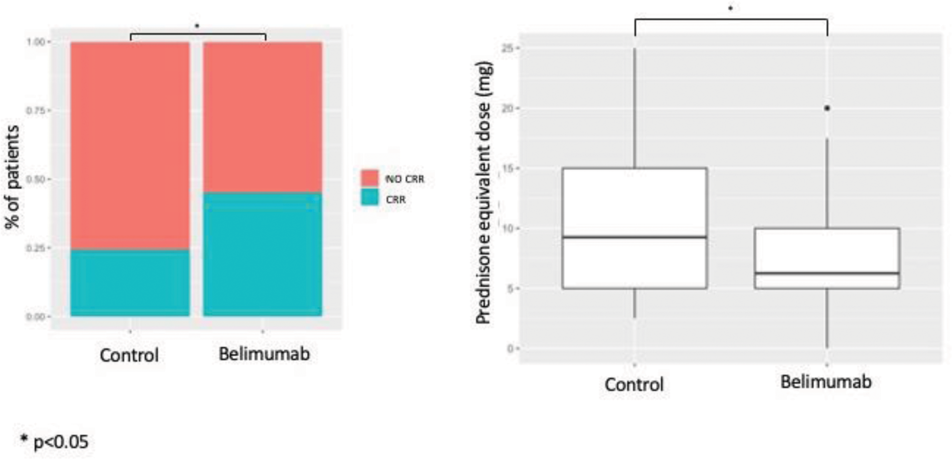 Proportion of patients achieving early complete renal response (CRR) (left) and prednisolone equivalent dose at complete renal response (right) in the control and belimumab cohorts after propensity score matching.