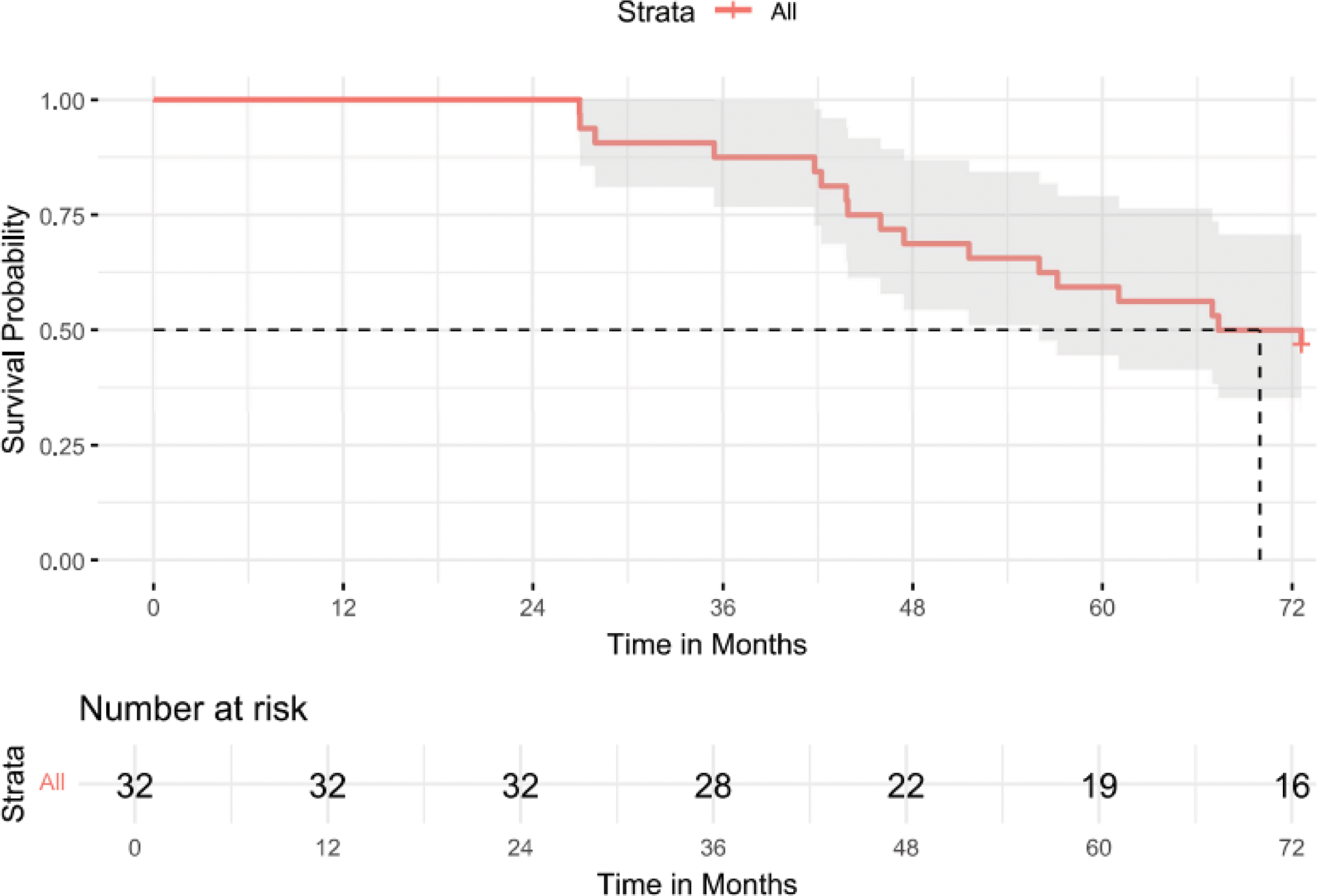 Kaplan-Meyer curve of the on-drug survival on secukinumab during the extended follow-up of the PSARTROS study.